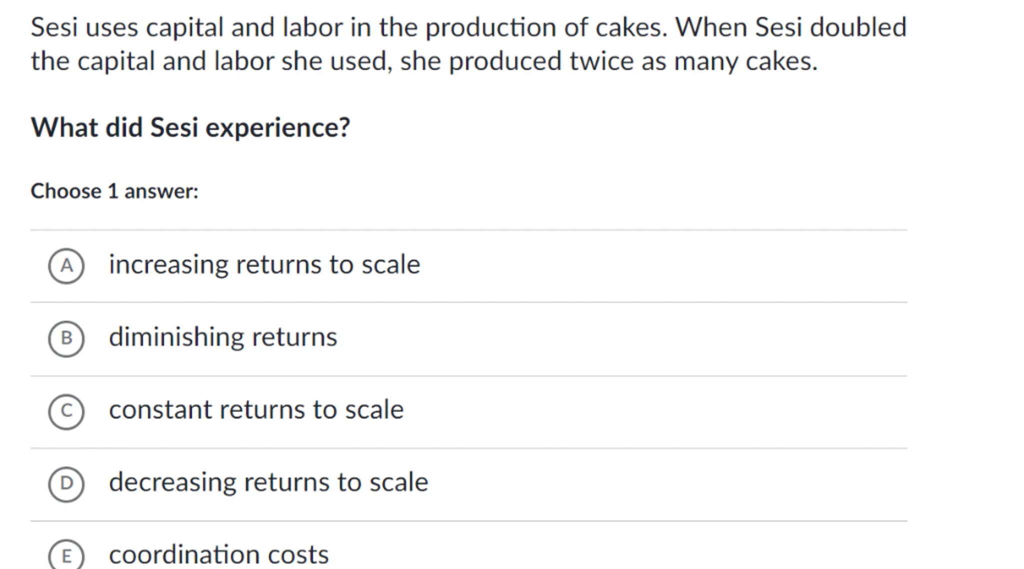 Sesi uses capital and labor in the production of cakes. When Sesi doubled the capital and labor she used, she produced twice as many cakes.