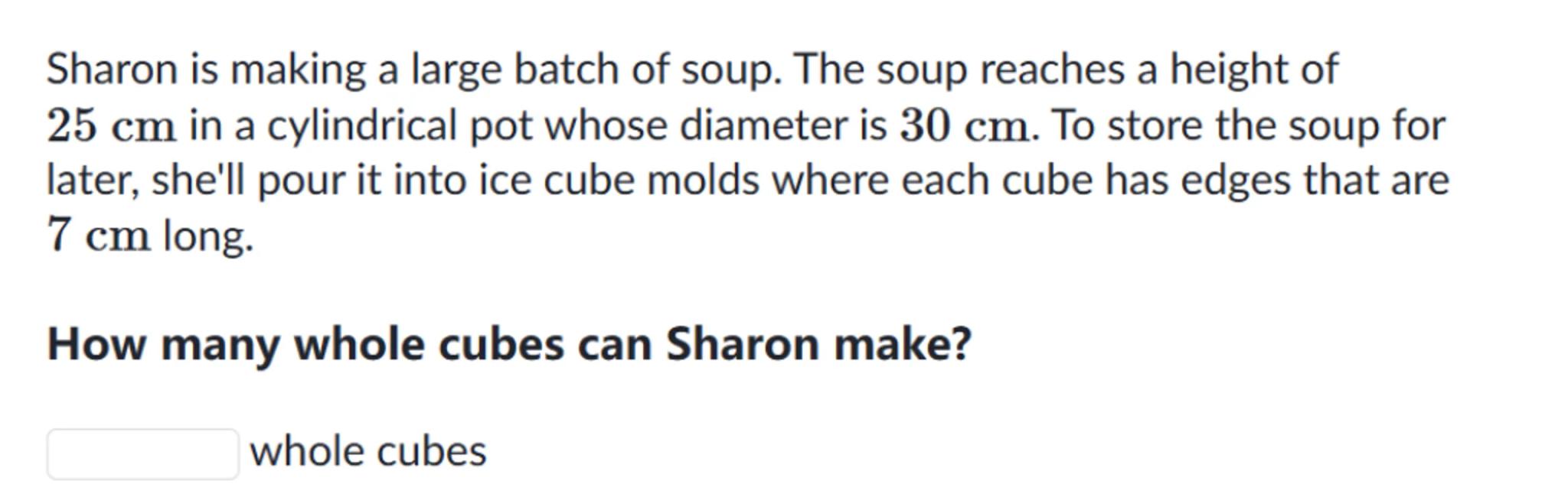 Sharon is making a large batch of soup. The soup reaches a height of in a cylindrical pot whose diameter is . To store the soup for later, she'll pour it into ice cube molds where each cube has edges that are long.