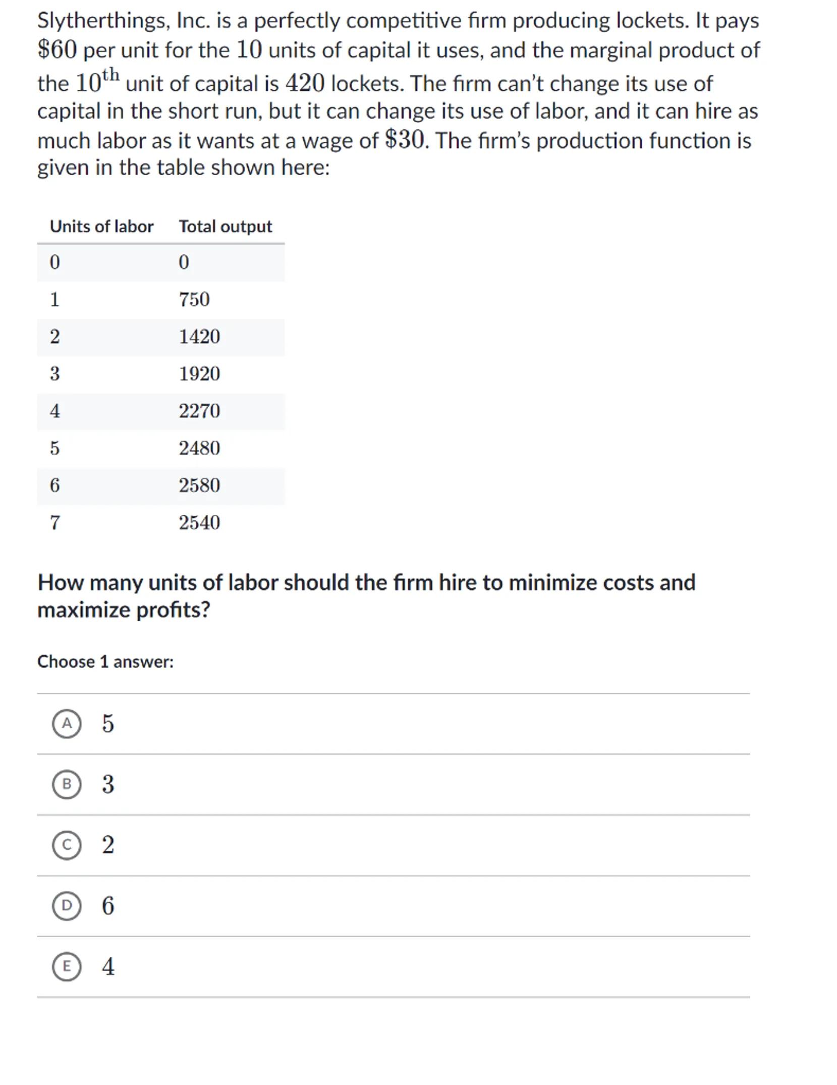 Slytherthings, Inc. is a perfectly competitive firm producing lockets. It pays per unit for the 10 units of capital it uses, and the marginal product of the unit of capital is 420 lockets. The firm can't change its use of capital in the short run, but it can change its use of labor, and it can hire as much labor as it wants at a wage of . The firm's production function is given in the table shown here: