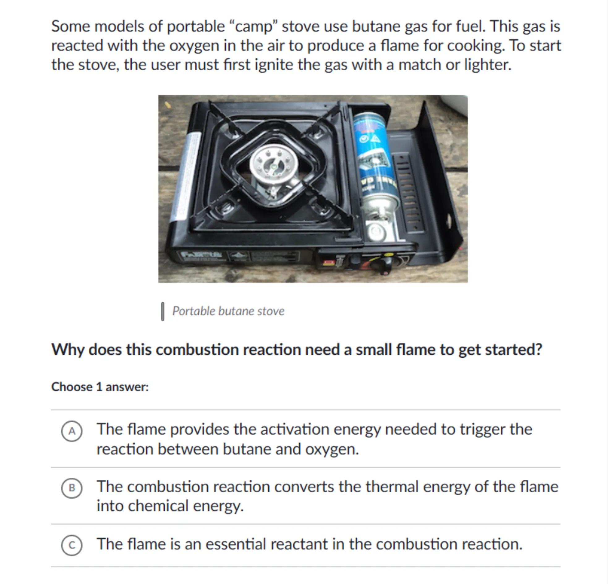 (A) The flame provides the activation energy needed to trigger the reaction between butane and oxygen.