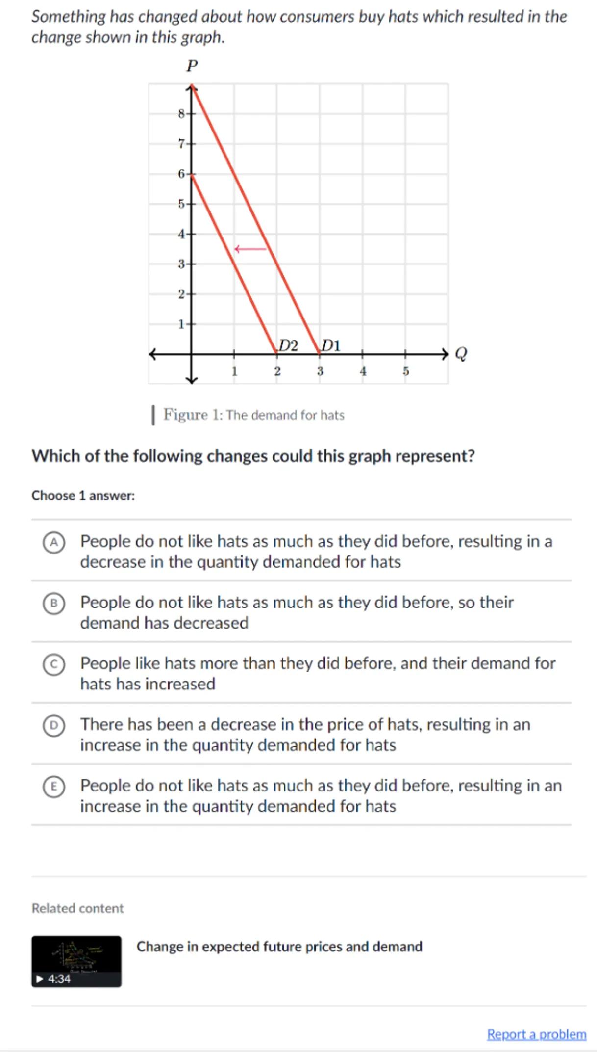 (A) People do not like hats as much as they did before, resulting in a decrease in the quantity demanded for hats