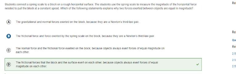 Students connect a spring scale to a block on a rough horizontal surface. The students use the spring scale to measure the magnitude of the horizontal force needed to pull the block at a constant speed. Which of the following statements explains why two forces exerted between objects are equal in magnitude?