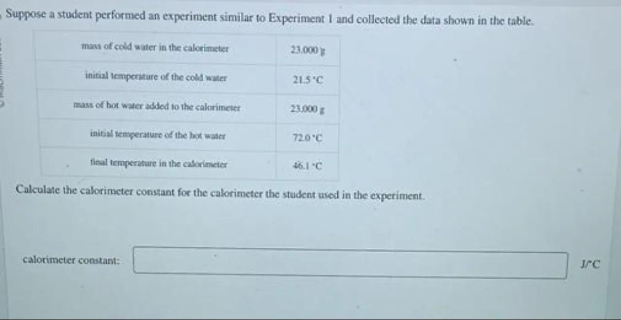 Calculate the calorimeter constant for the calorimeter the student used in the experiment.