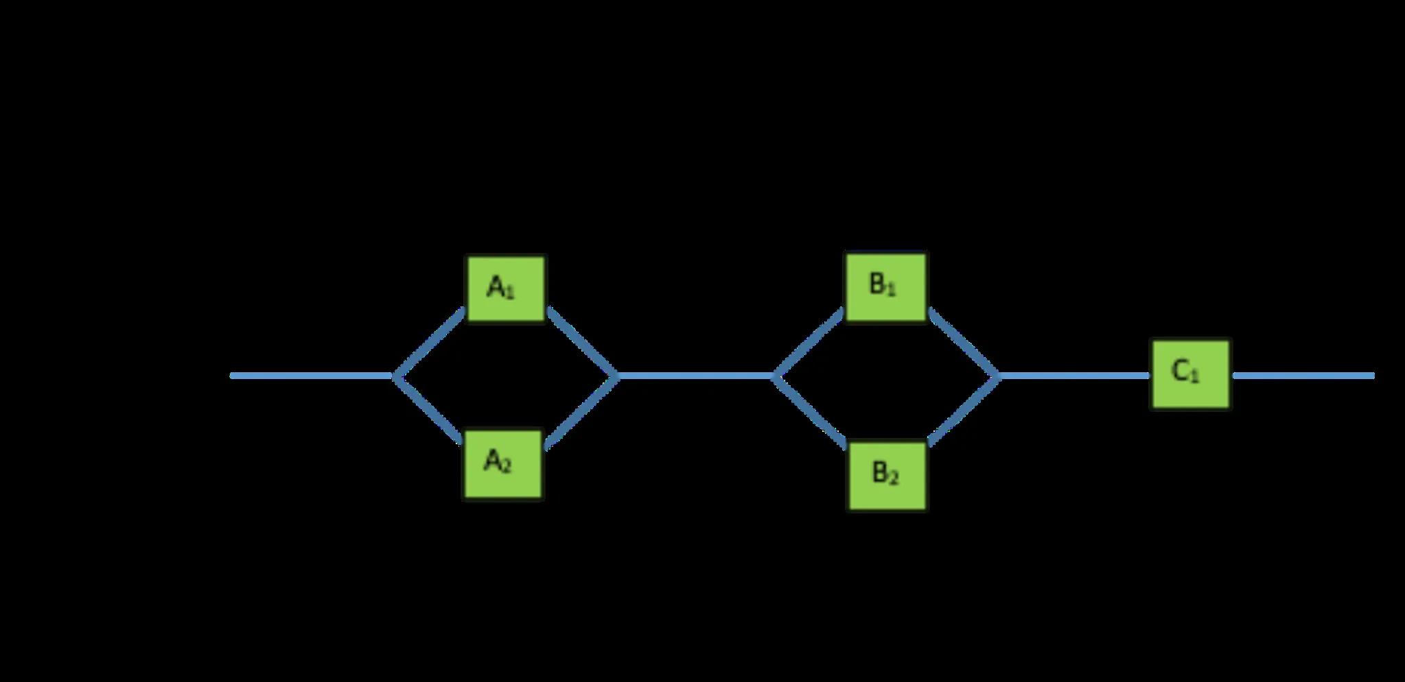 Suppose components A1, A2, B1, B2 and C1 operate independently in the system shown below. Assume that all the components in the system start operating at the same time and a component does not work again once it fails. The probability of functioning for each component is 0.92. The entire system works if A1 or A2 works, and B1 or B2 works, and C1 works. Find the probability that the entire system works. Show your reasoning.