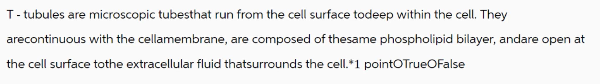 T - tubules are microscopic tubesthat run from the cell surface todeep within the cell. They arecontinuous with the cellamembrane, are composed of thesame phospholipid bilayer, andare open at the cell surface tothe extracellular fluid thatsurrounds the cell.*1 pointOTrueOFalse