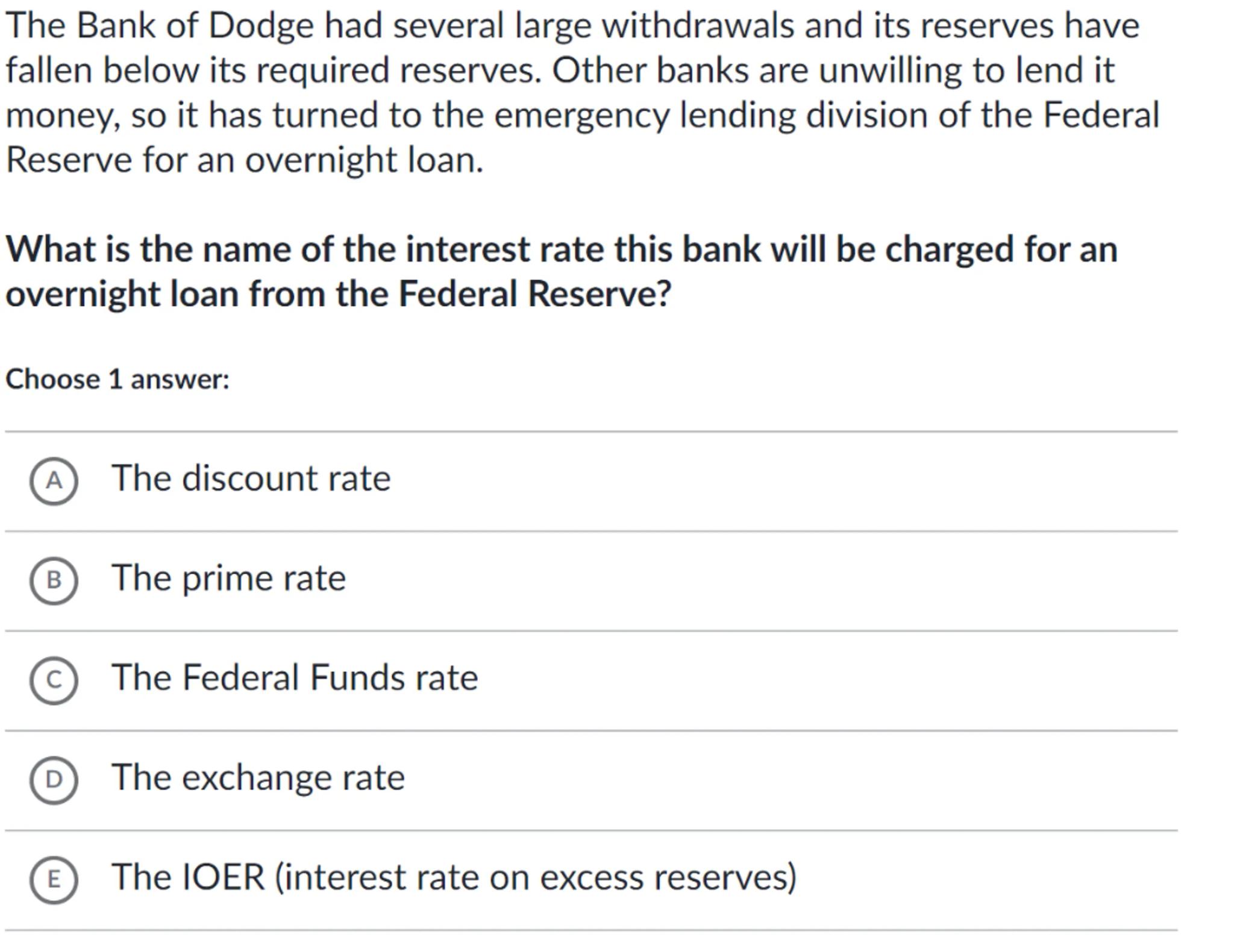 The Bank of Dodge had several large withdrawals and its reserves have fallen below its required reserves. Other banks are unwilling to lend it money, so it has turned to the emergency lending division of the Federal Reserve for an overnight loan.