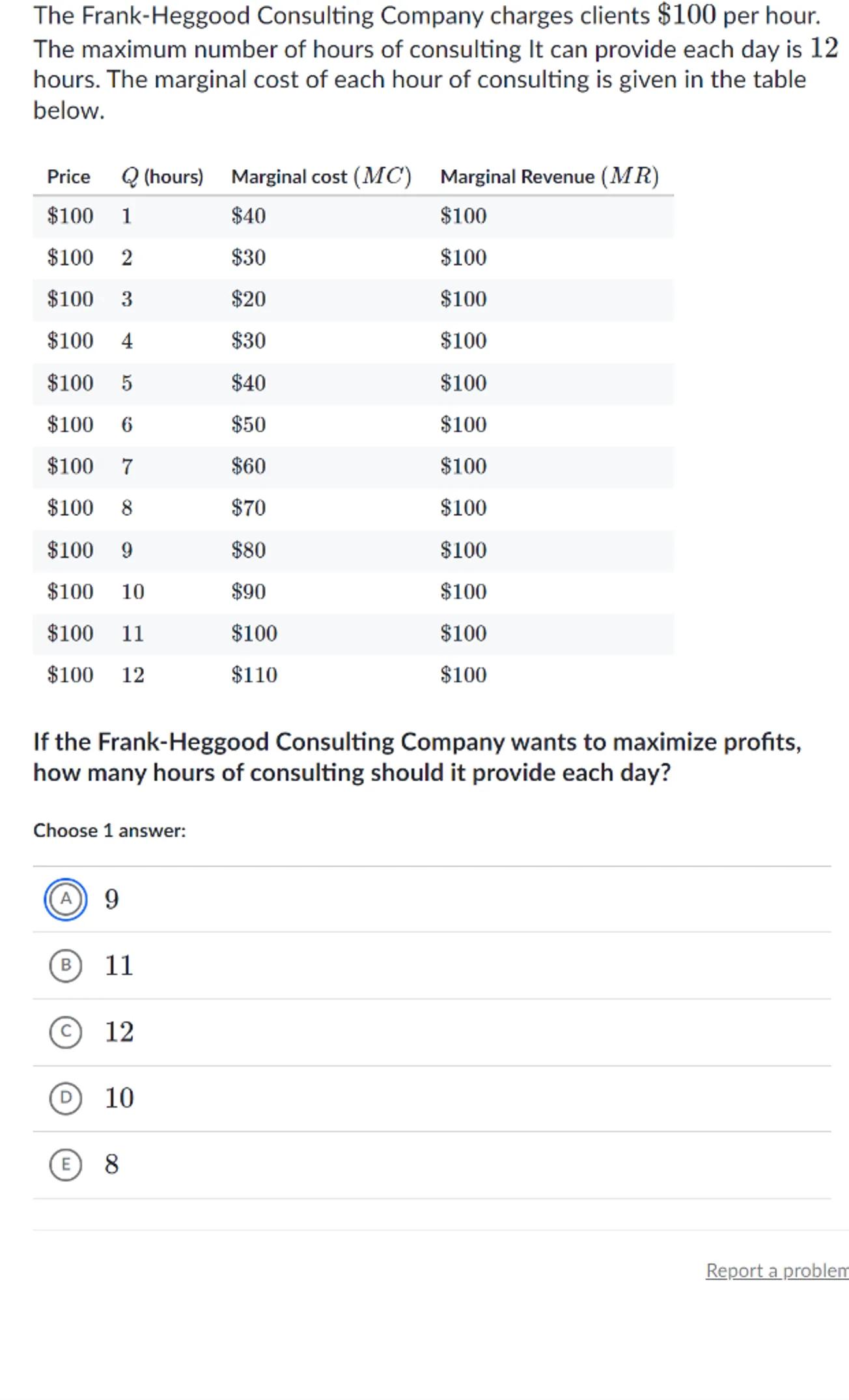 The Frank-Heggood Consulting Company charges clients per hour. The maximum number of hours of consulting It can provide each day is 12 hours. The marginal cost of each hour of consulting is given in the table below.