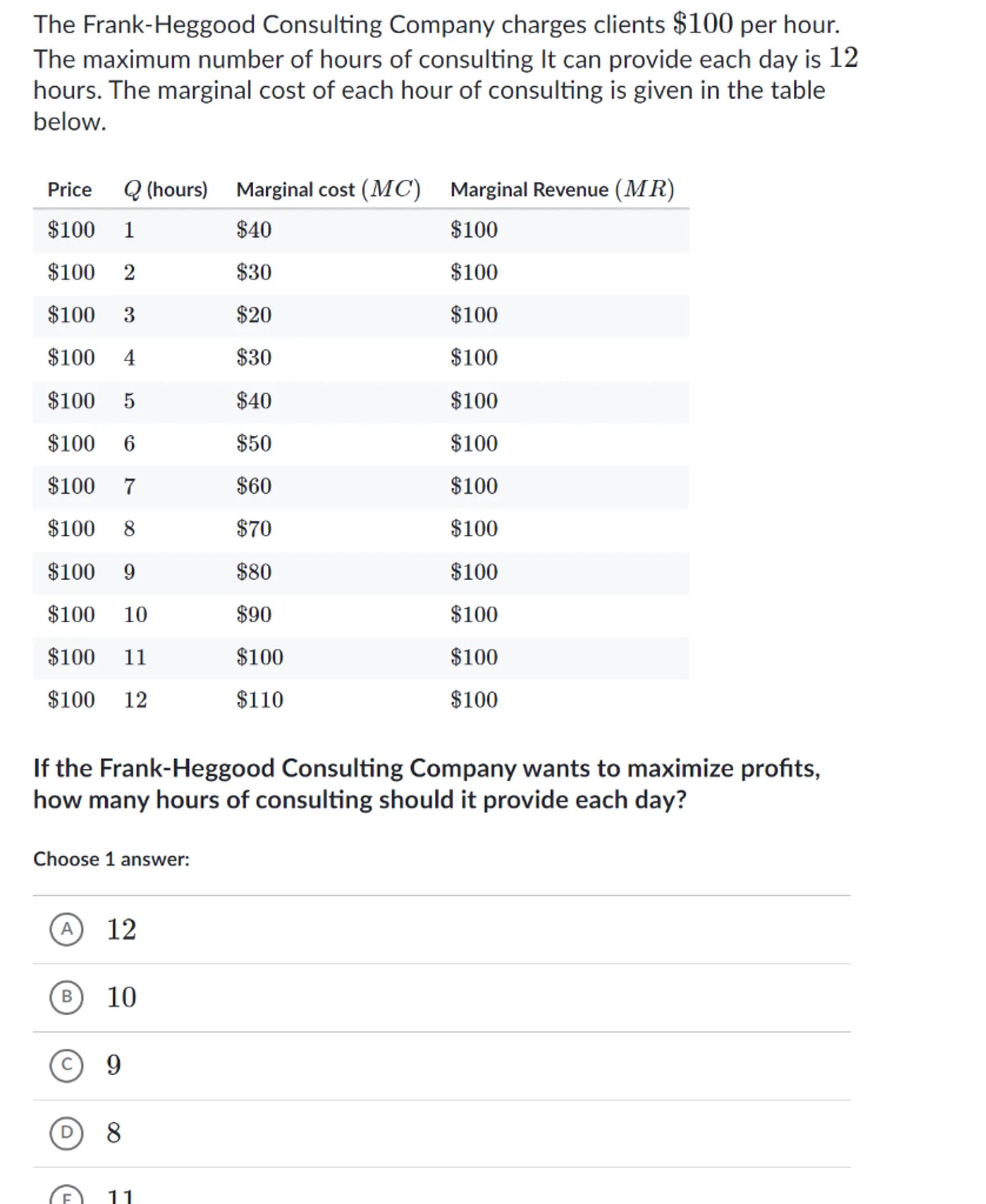 The Frank-Heggood Consulting Company charges clients per hour. The maximum number of hours of consulting It can provide each day is 12 hours. The marginal cost of each hour of consulting is given in the table below.