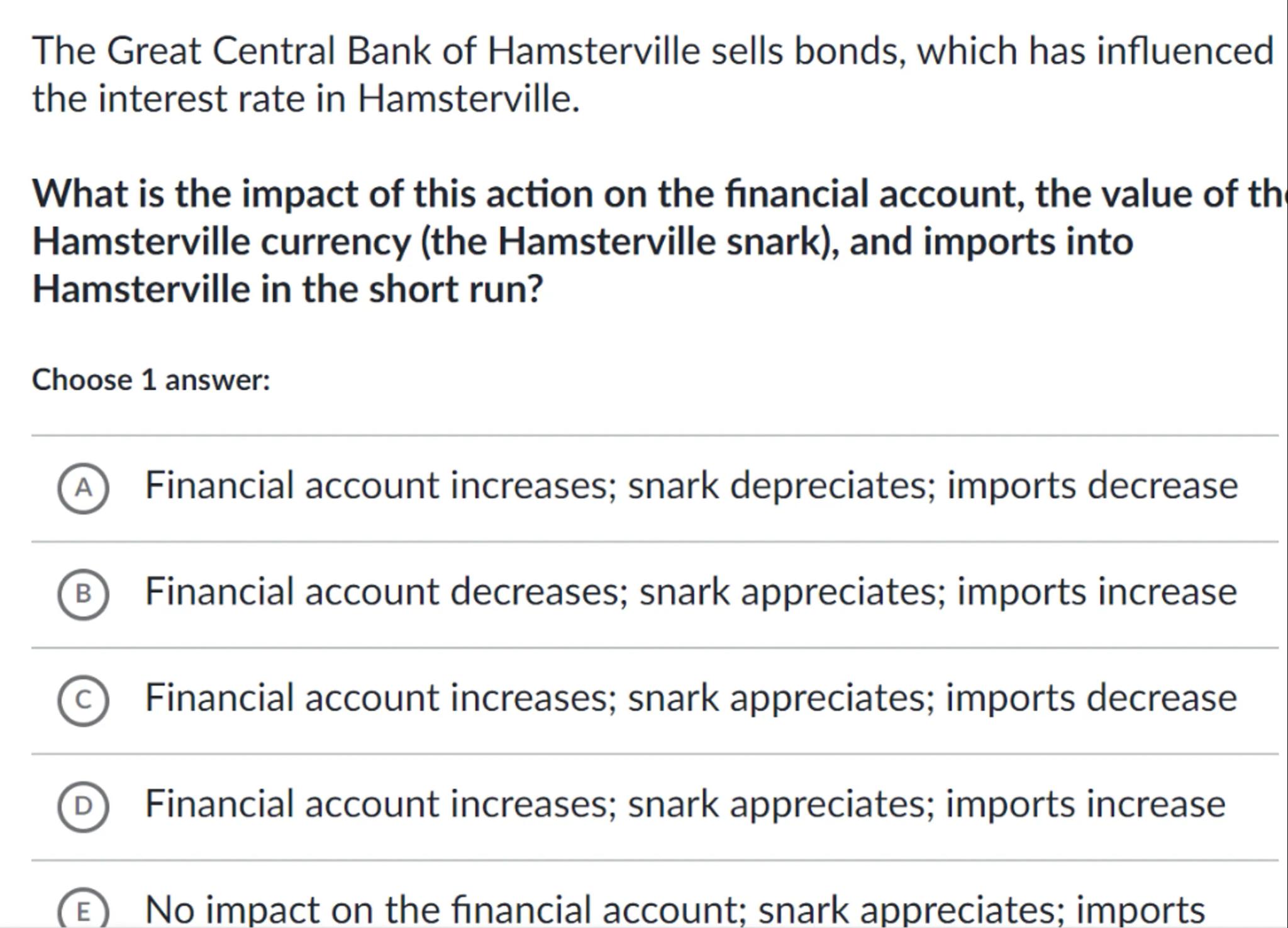 What is the impact of this action on the financial account, the value of th Hamsterville currency (the Hamsterville snark), and imports into Hamsterville in the short run?