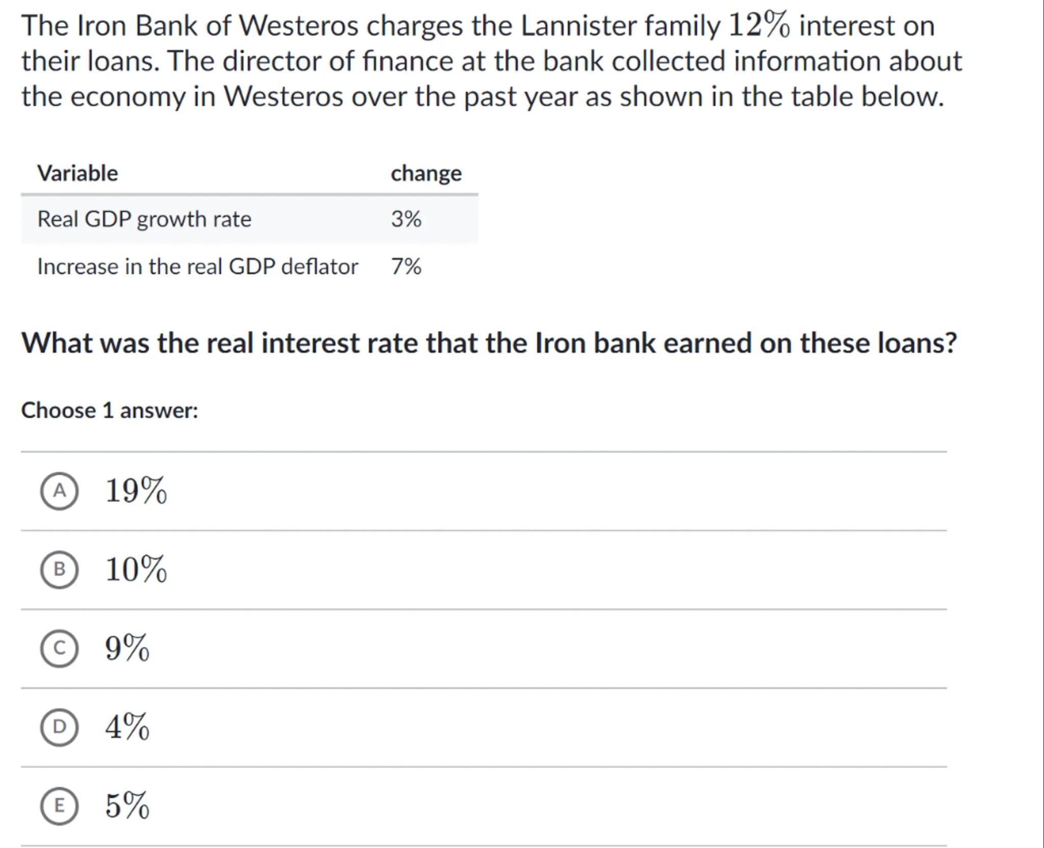 The Iron Bank of Westeros charges the Lannister family interest on their loans. The director of finance at the bank collected information about the economy in Westeros over the past year as shown in the table below.