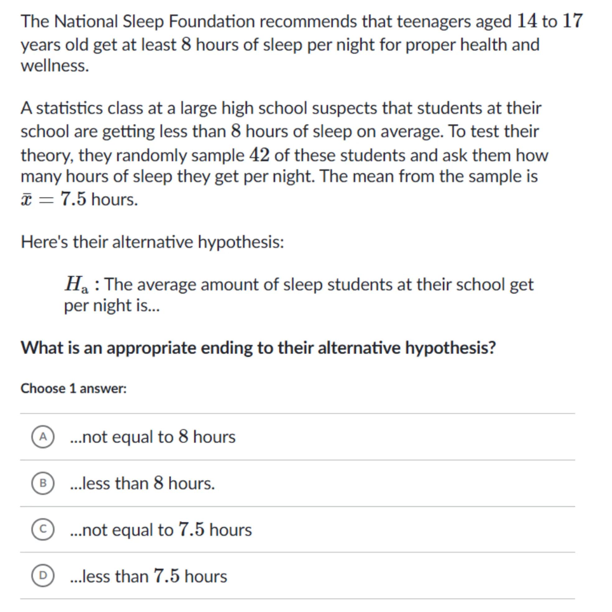 A statistics class at a large high school suspects that students at their school are getting less than 8 hours of sleep on average. To test their theory, they randomly sample 42 of these students and ask them how many hours of sleep they get per night. The mean from the sample is  hours.