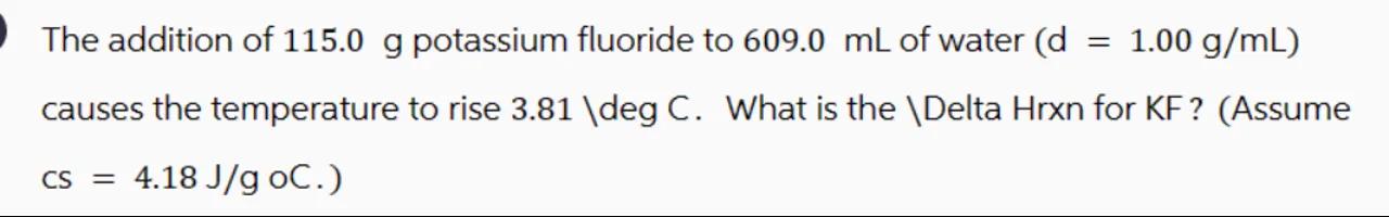 The addition of potassium fluoride to of water causes the temperature to rise . What is the Delta Hrxn for KF? (Assume oC.)