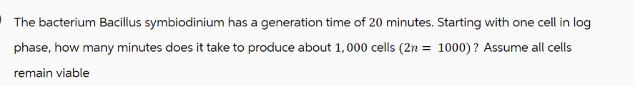 The bacterium Bacillus symbiodinium has a generation time of 20 minutes. Starting with one cell in log phase, how many minutes does it take to produce about 1,000 cells ? Assume all cells remain viable