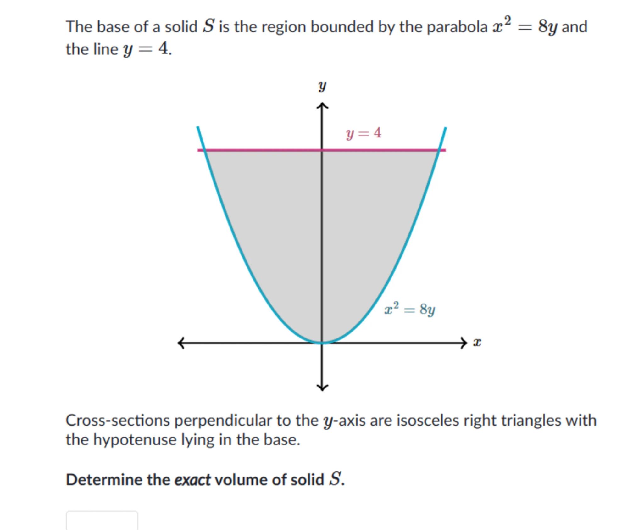 Cross-sections perpendicular to the -axis are isosceles right triangles with the hypotenuse lying in the base.