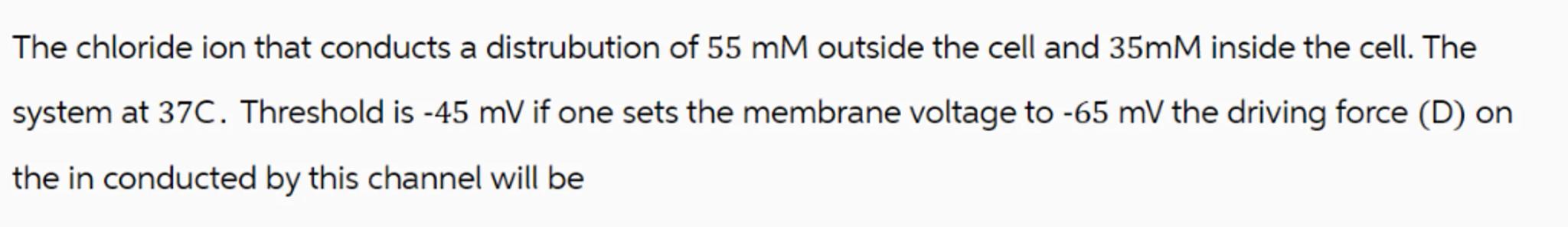 The chloride ion that conducts a distrubution of outside the cell and inside the cell. The system at . Threshold is if one sets the membrane voltage to the driving force (D) on the in conducted by this channel will be