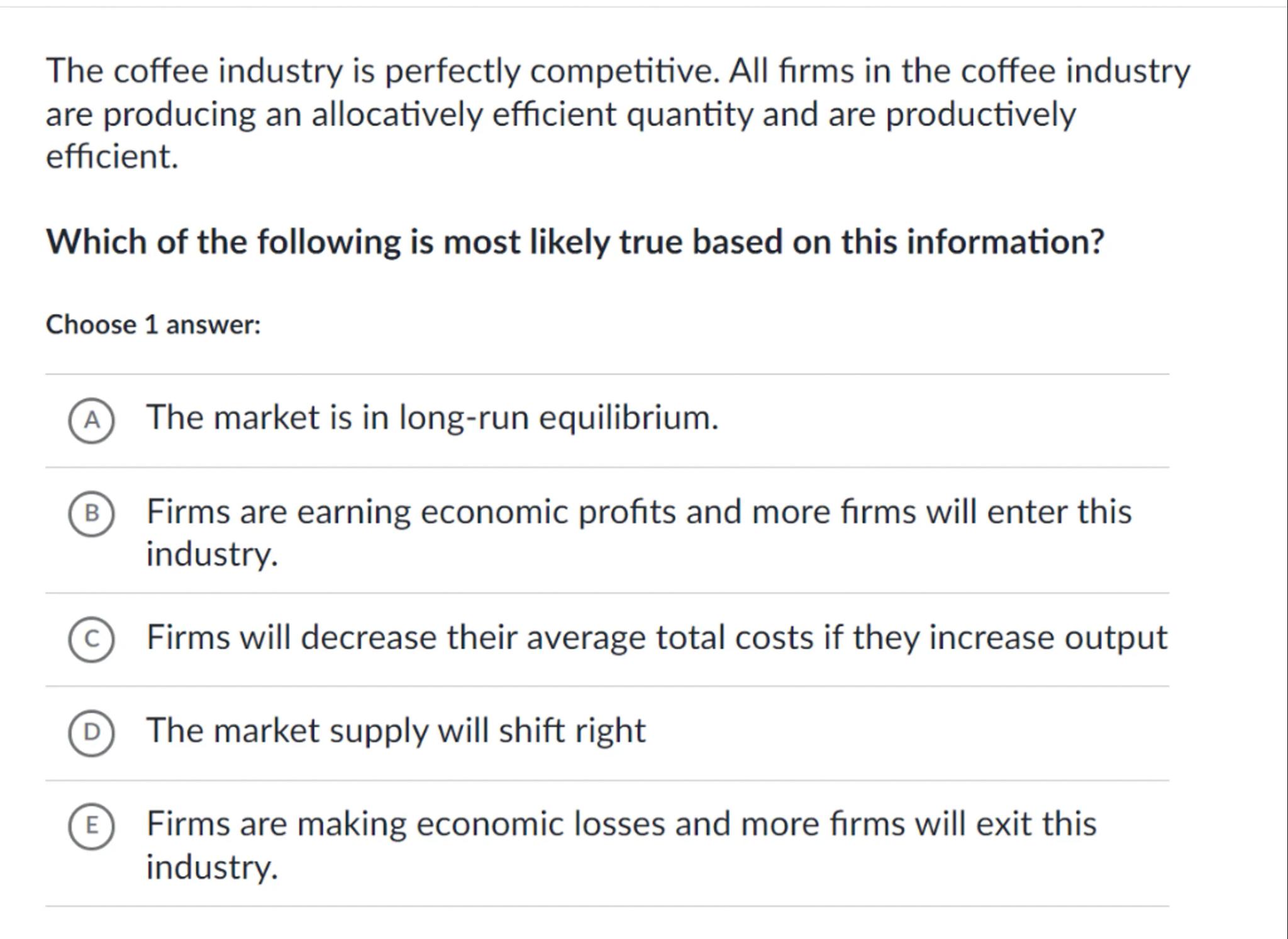 The coffee industry is perfectly competitive. All firms in the coffee industry are producing an allocatively efficient quantity and are productively efficient.