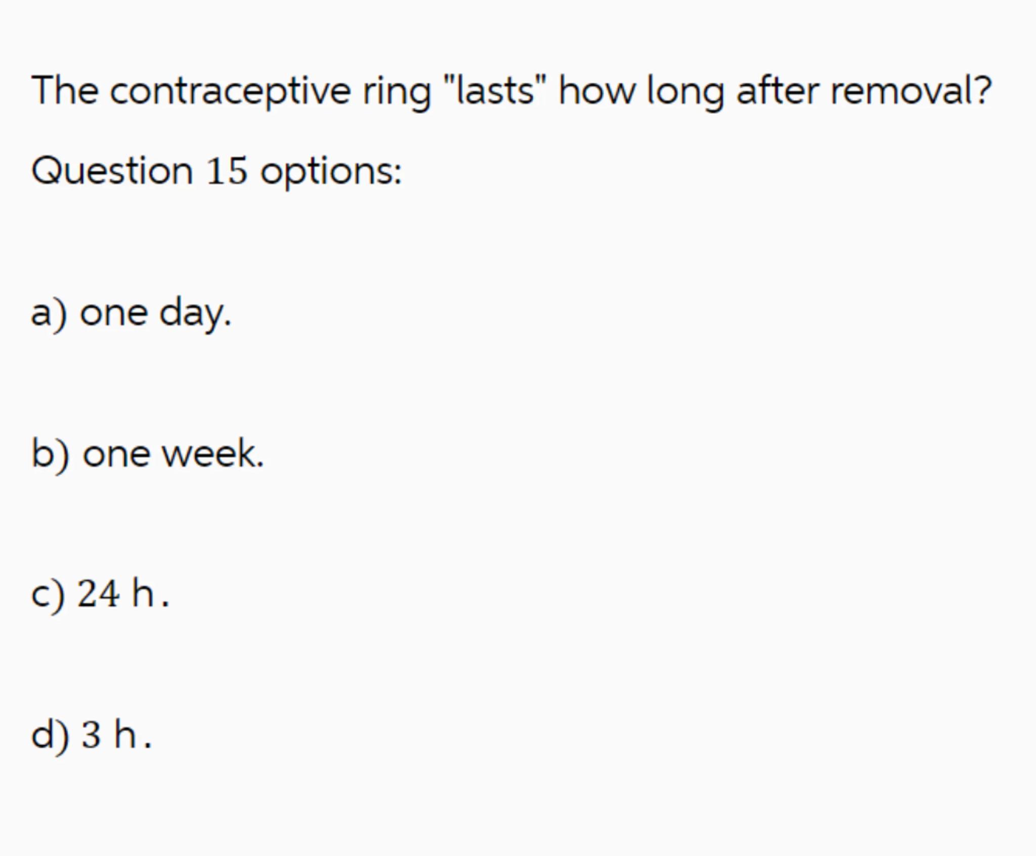 The contraceptive ring "lasts" how long after removal? Question 15 options: