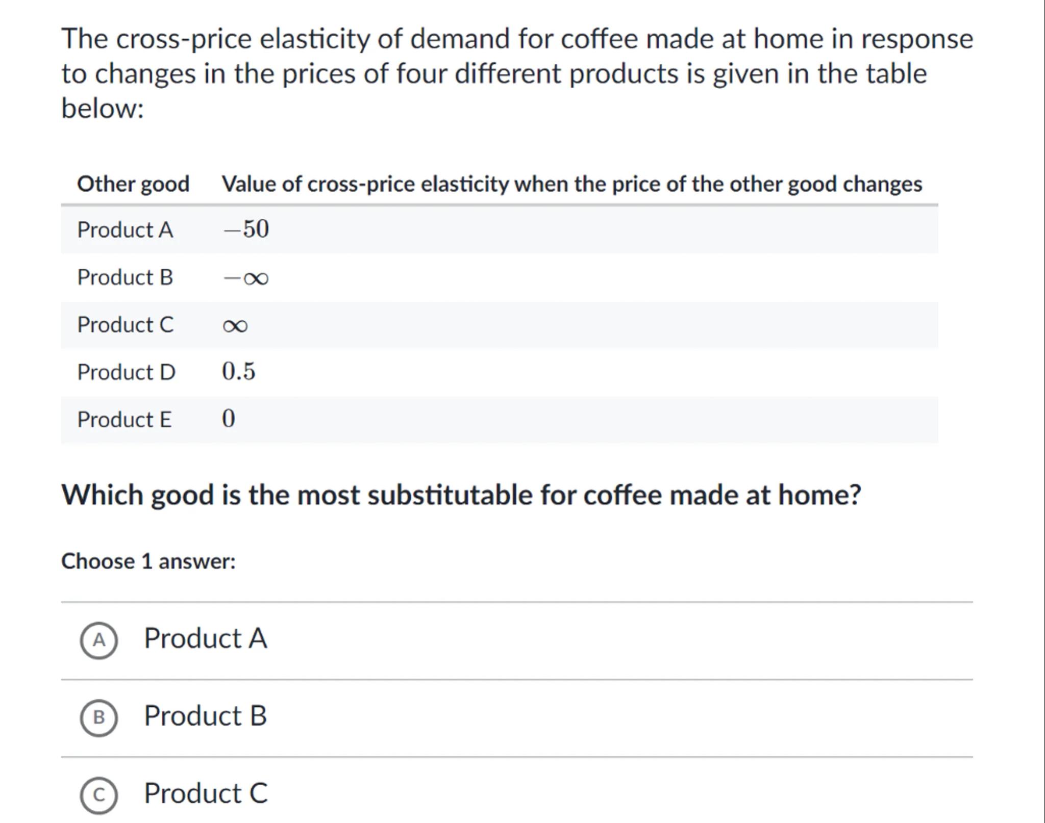 The cross-price elasticity of demand for coffee made at home in response to changes in the prices of four different products is given in the table below: