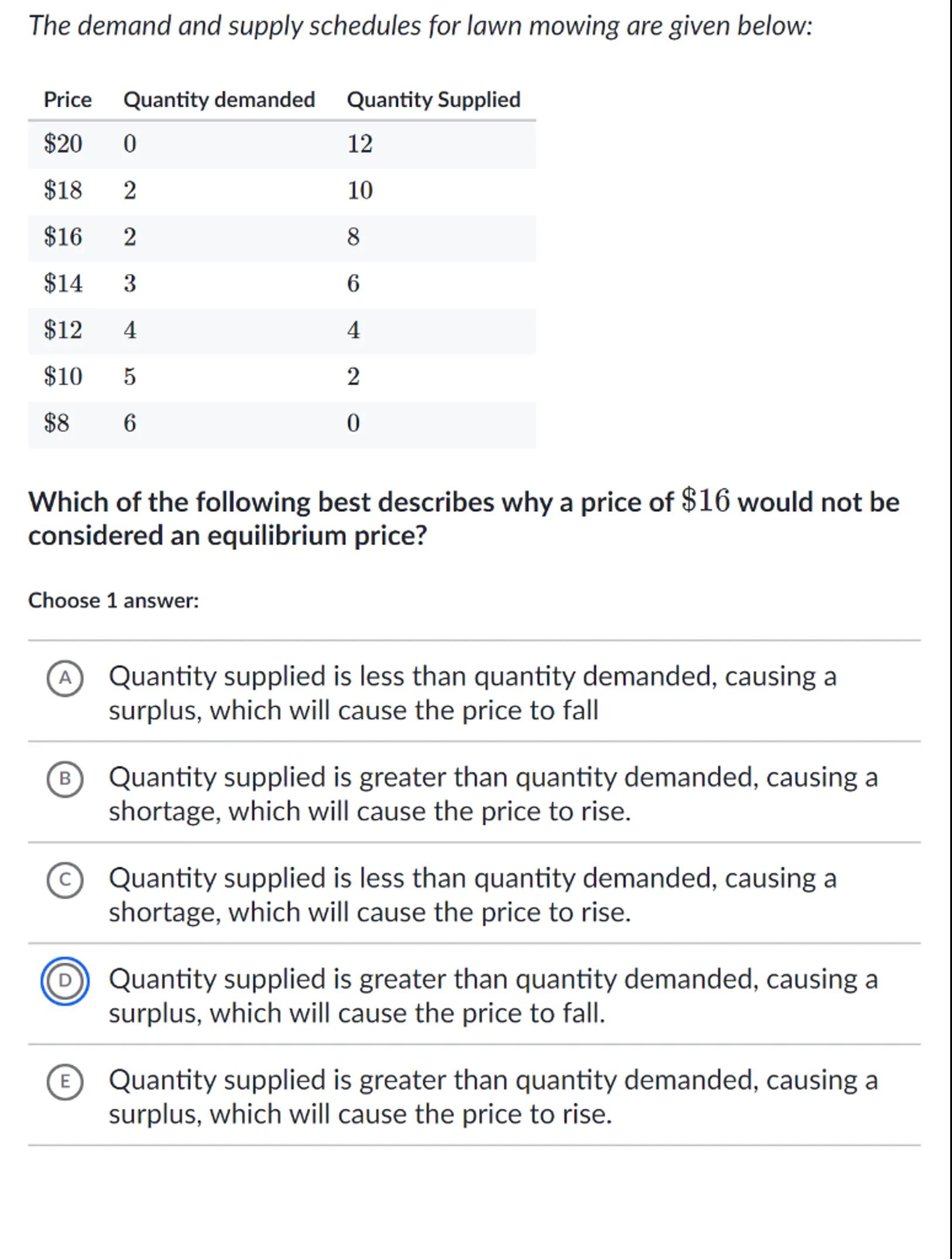 (D) Quantity supplied is greater than quantity demanded, causing a surplus, which will cause the price to fall.
