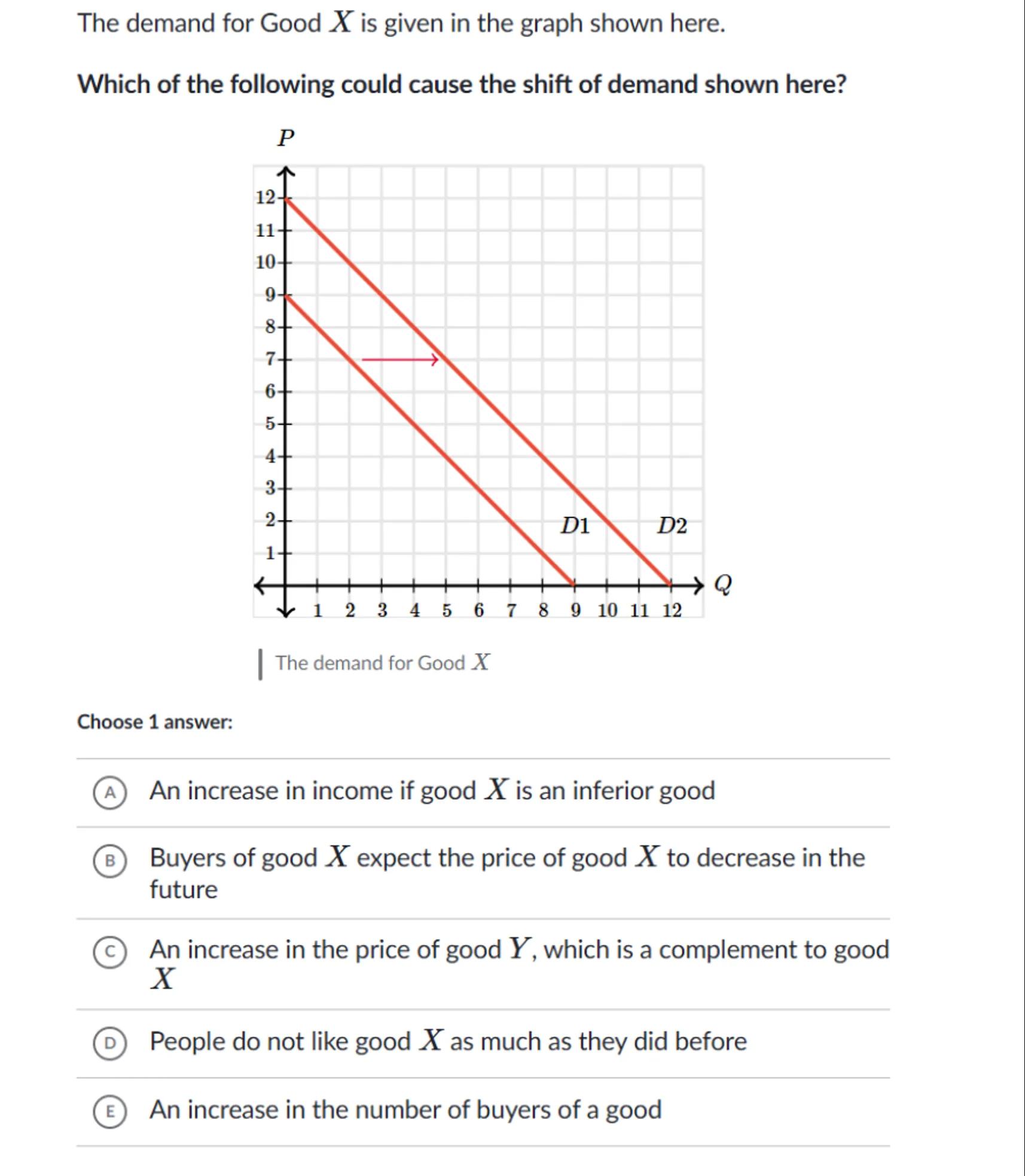 - Option (A): An increase in income if Good is an inferior good would decrease demand, not increase it. This is incorrect.
