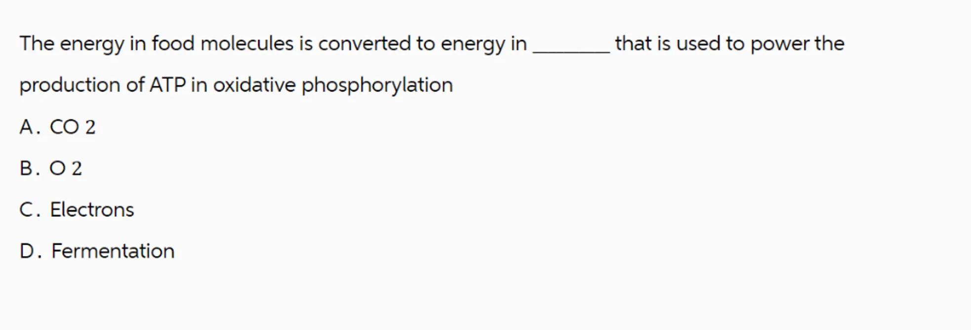 The energy in food molecules is converted to energy in that is used to power the production of ATP in oxidative phosphorylation