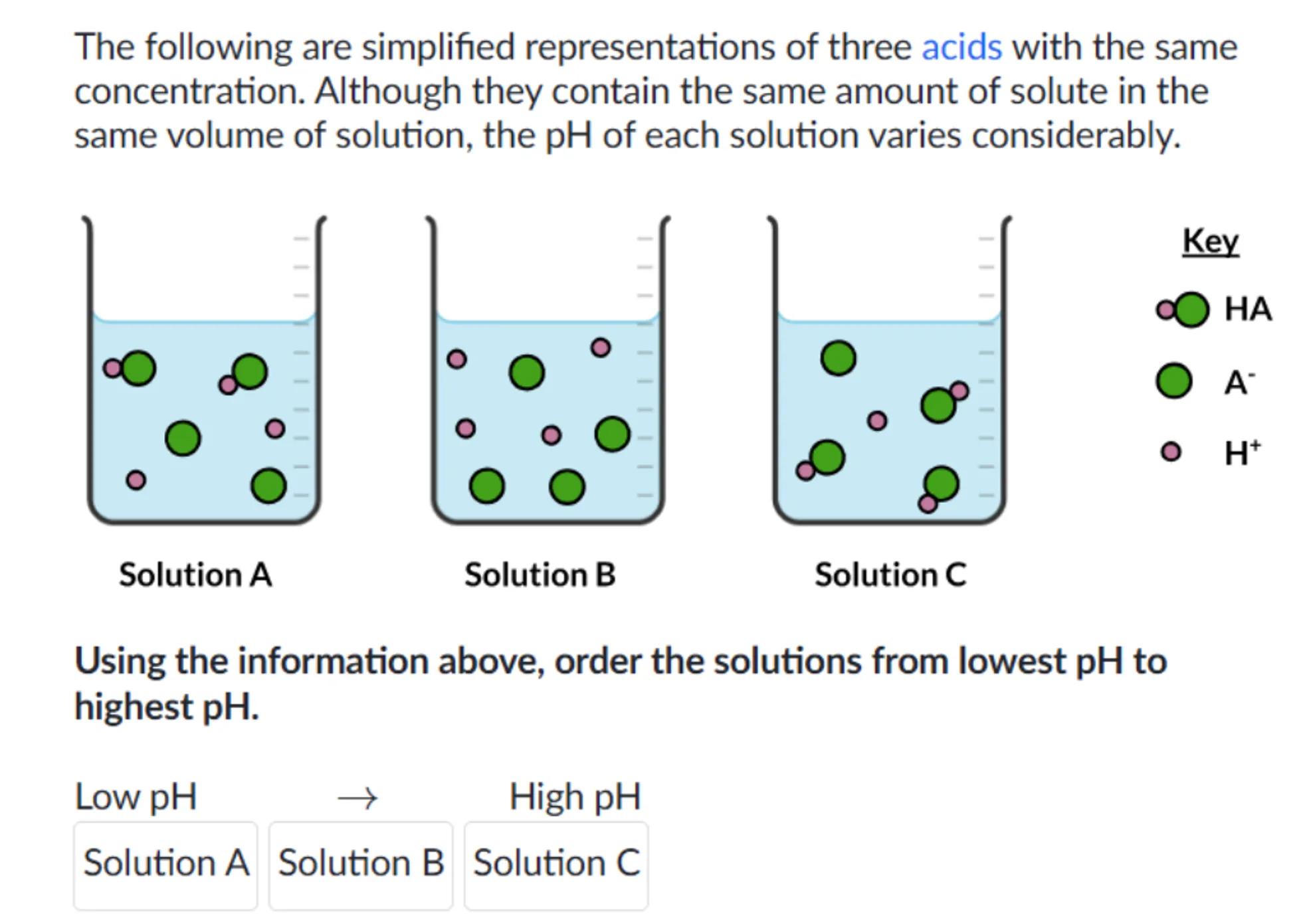 The following are simplified representations of three acids with the same concentration. Although they contain the same amount of solute in the same volume of solution, the of each solution varies considerably.