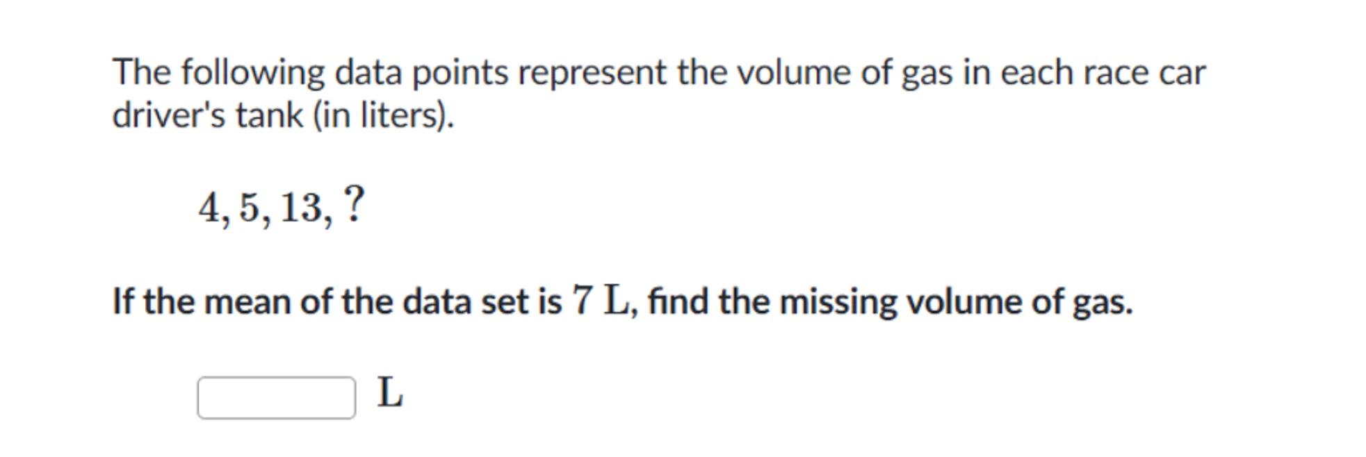The following data points represent the volume of gas in each race car driver's tank (in liters).