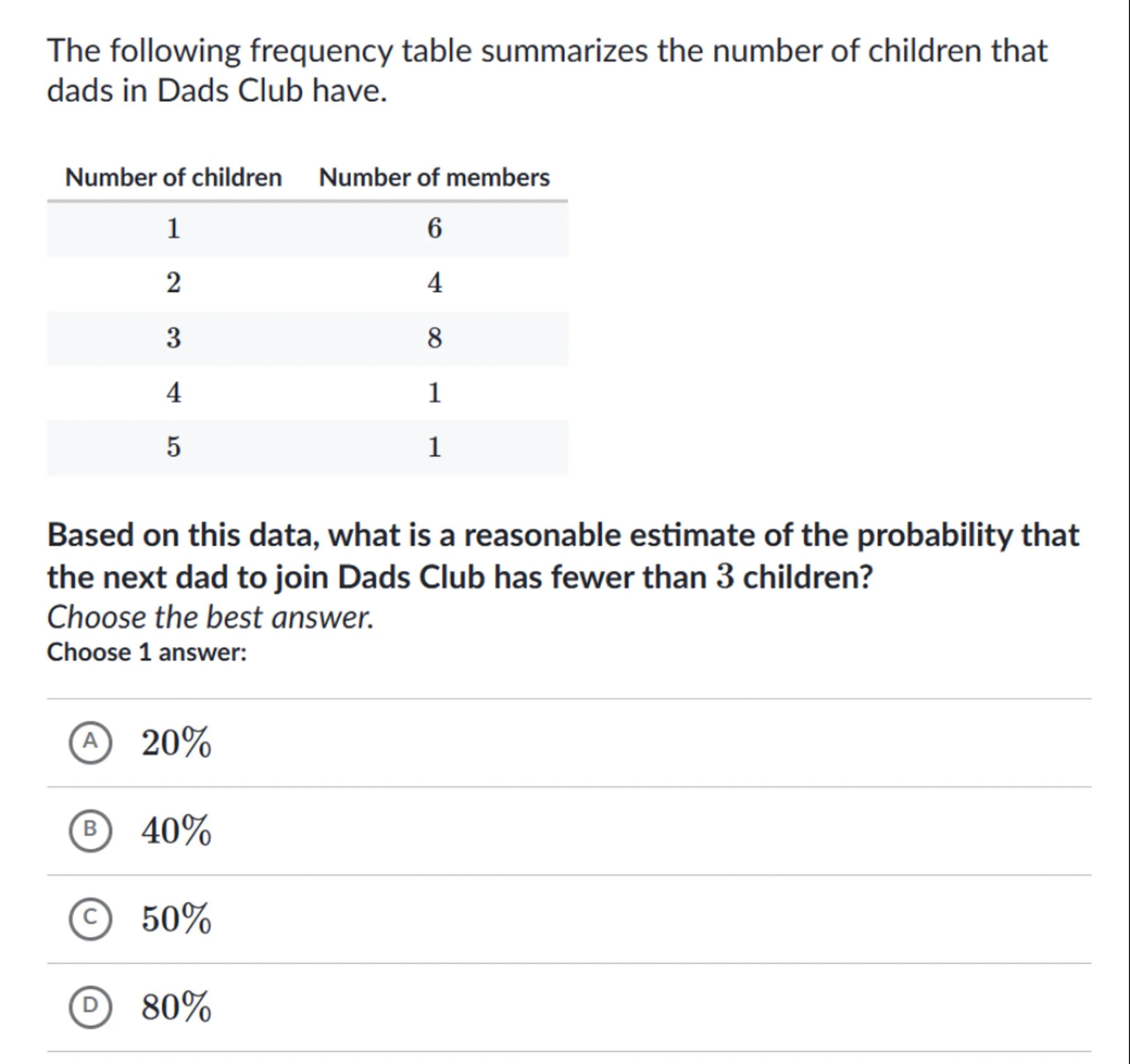 The following frequency table summarizes the number of children that dads in Dads Club have.