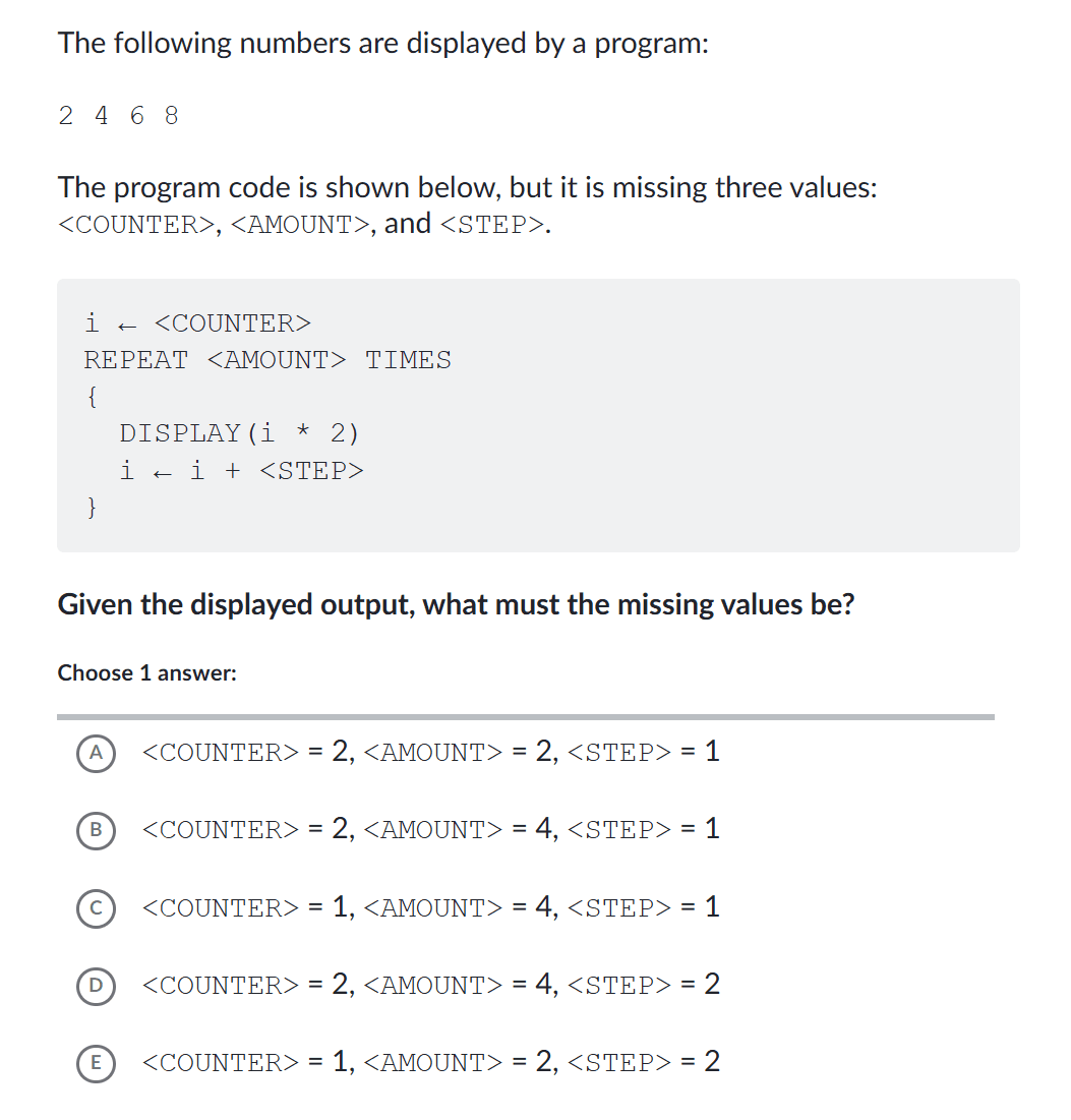 1. Choice A: <COUNTER> = 2, <AMOUNT> = 2, <STEP> = 1