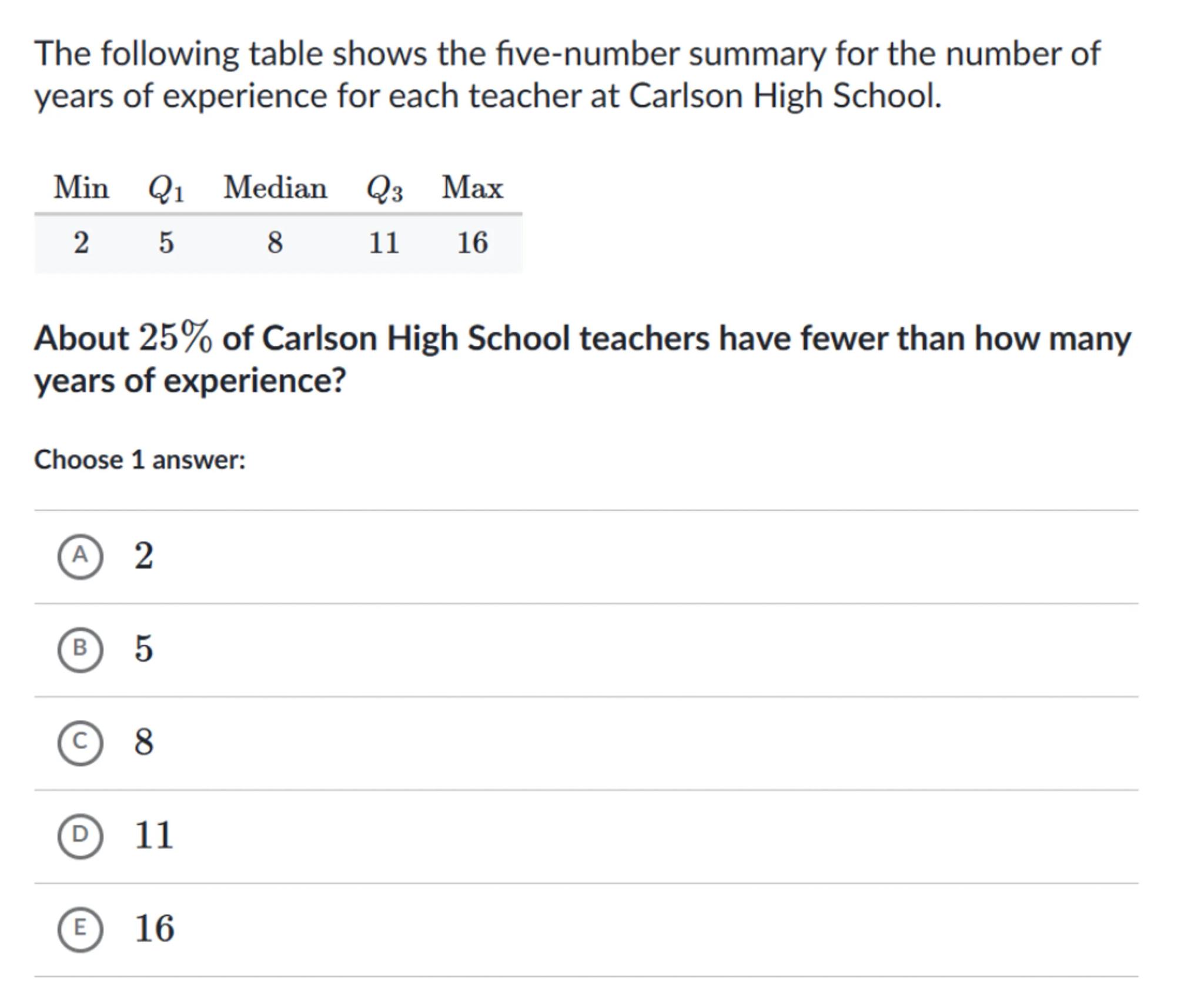 The following table shows the five-number summary for the number of years of experience for each teacher at Carlson High School.