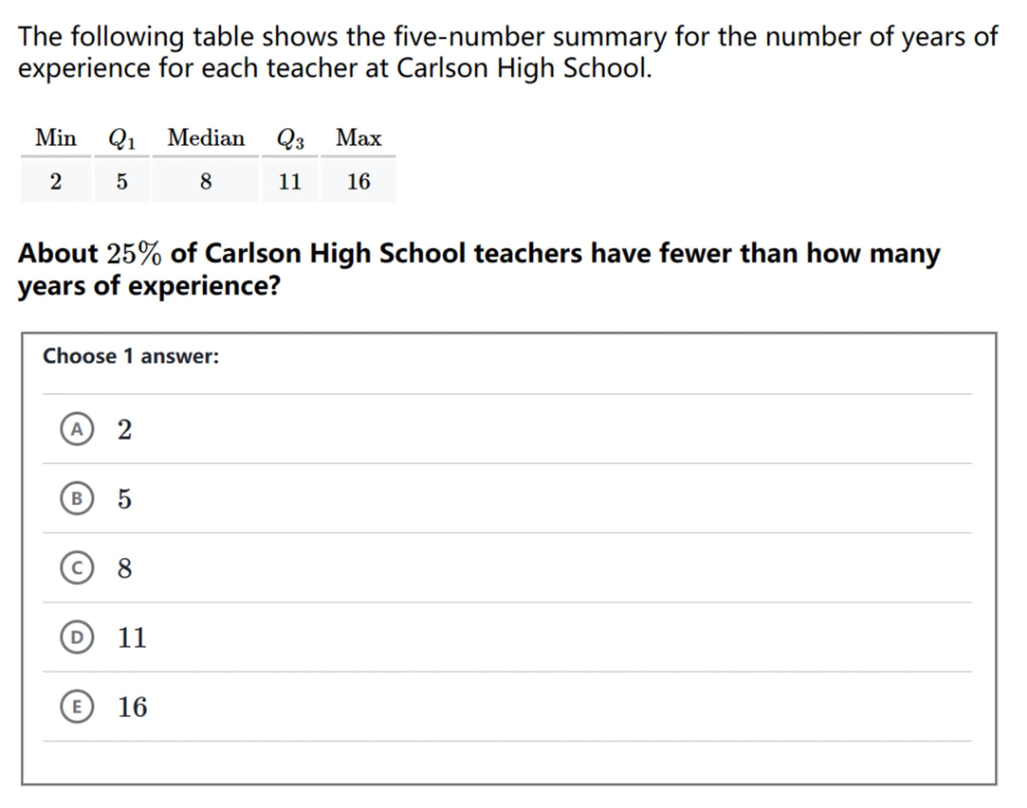 The following table shows the five-number summary for the number of years of experience for each teacher at Carlson High School.