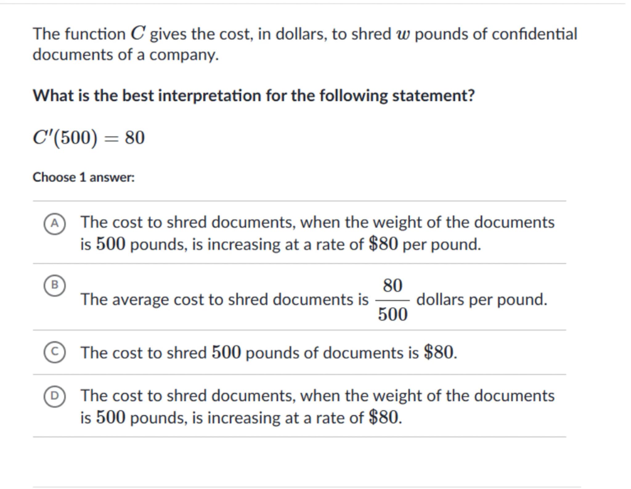 (A) The cost to shred documents, when the weight of the documents is 500 pounds, is increasing at a rate of per pound.