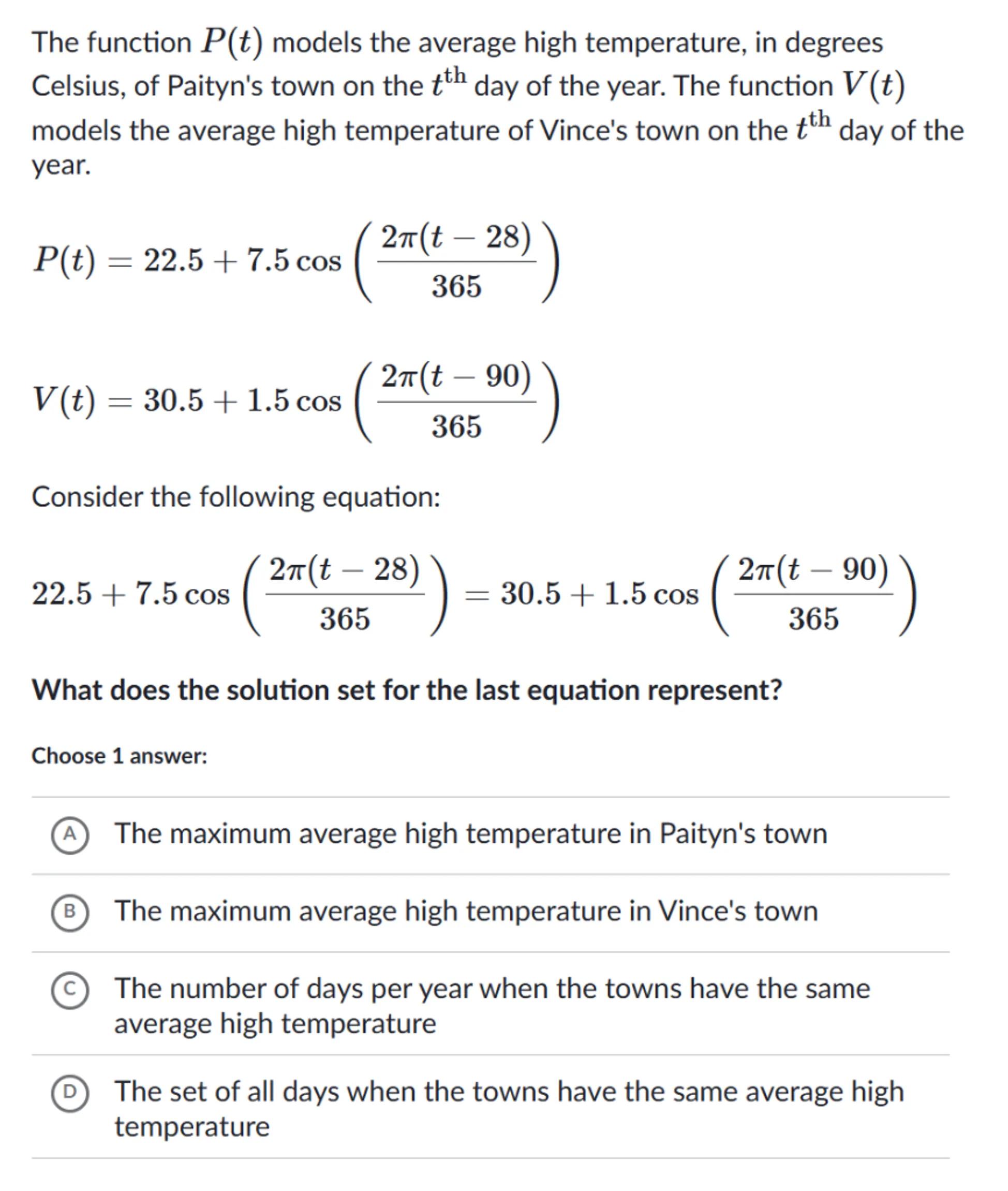 The function models the average high temperature, in degrees Celsius, of Paityn's town on the day of the year. The function models the average high temperature of Vince's town on the day of the year.