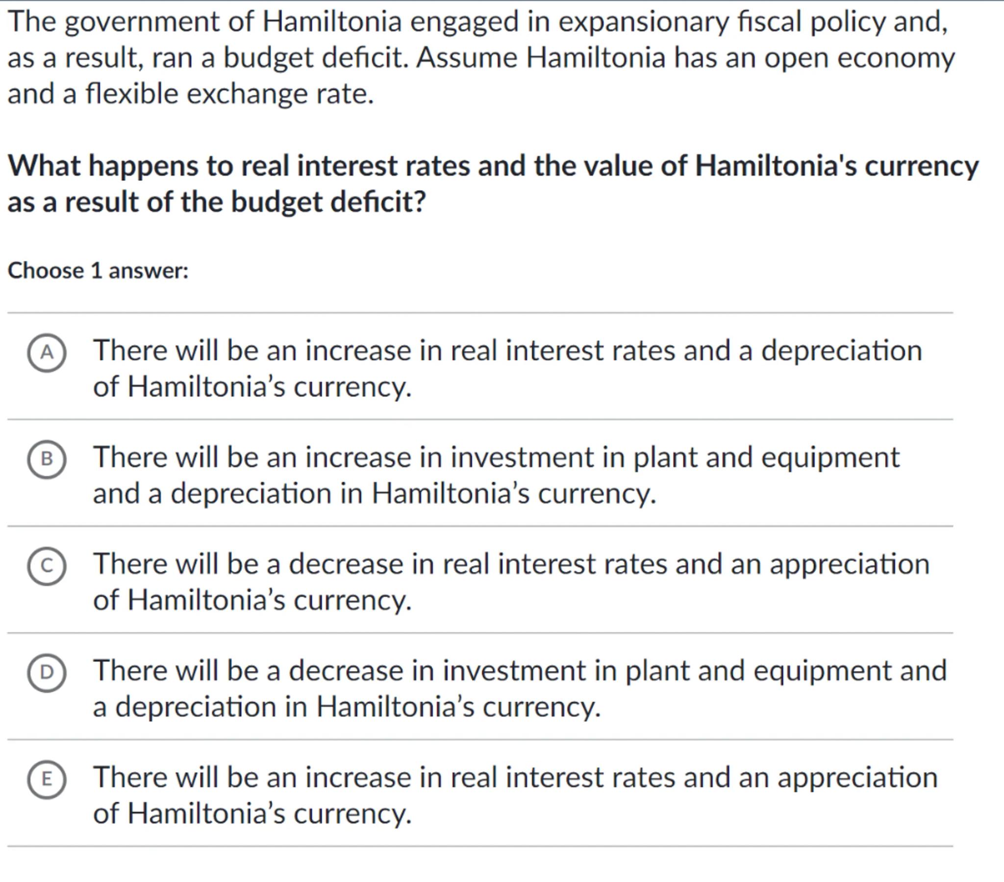 (A) There will be an increase in real interest rates and a depreciation of Hamiltonia's currency.