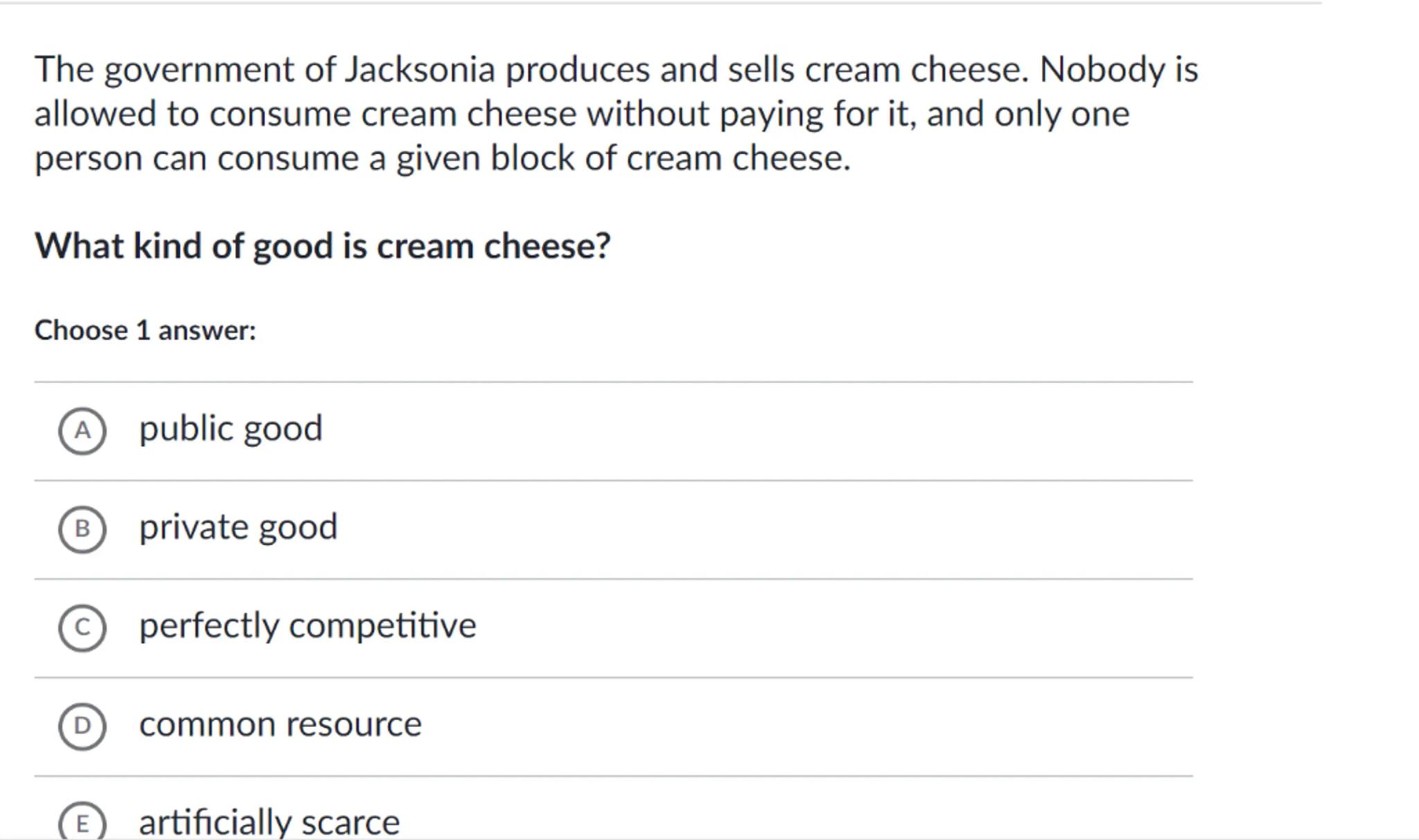 The government of Jacksonia produces and sells cream cheese. Nobody is allowed to consume cream cheese without paying for it, and only one person can consume a given block of cream cheese.