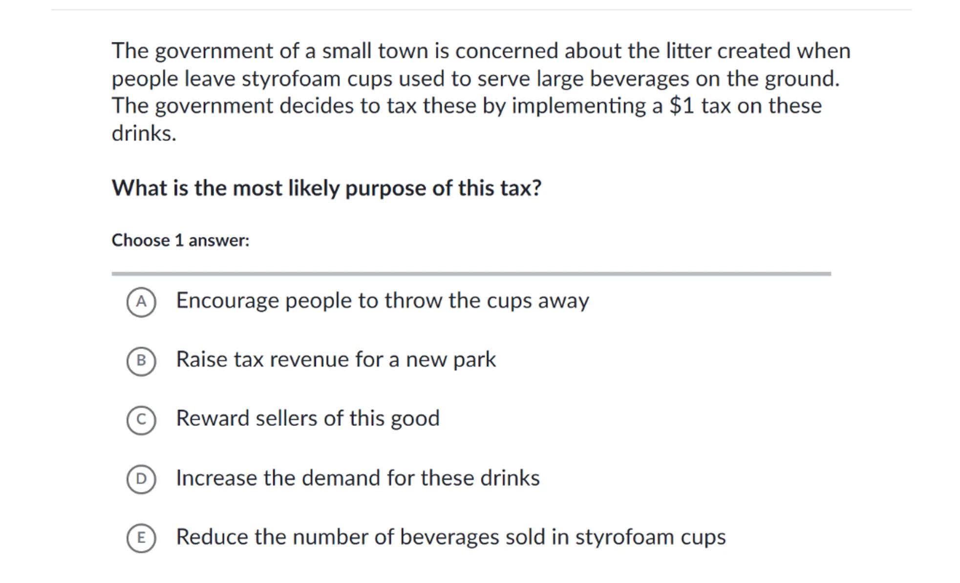 The government of a small town is concerned about the litter created when people leave styrofoam cups used to serve large beverages on the ground. The government decides to tax these by implementing a tax on these drinks.