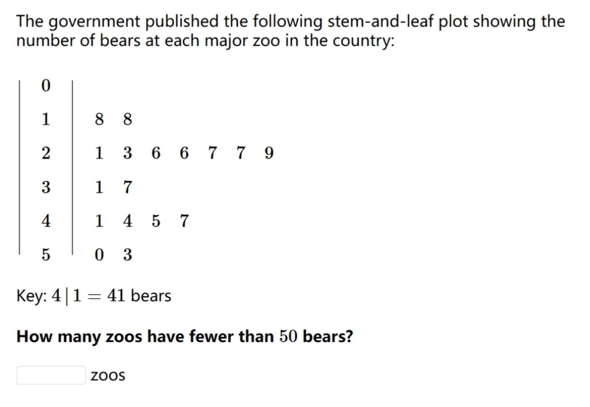 The government published the following stem-and-leaf plot showing the number of bears at each major zoo in the country: