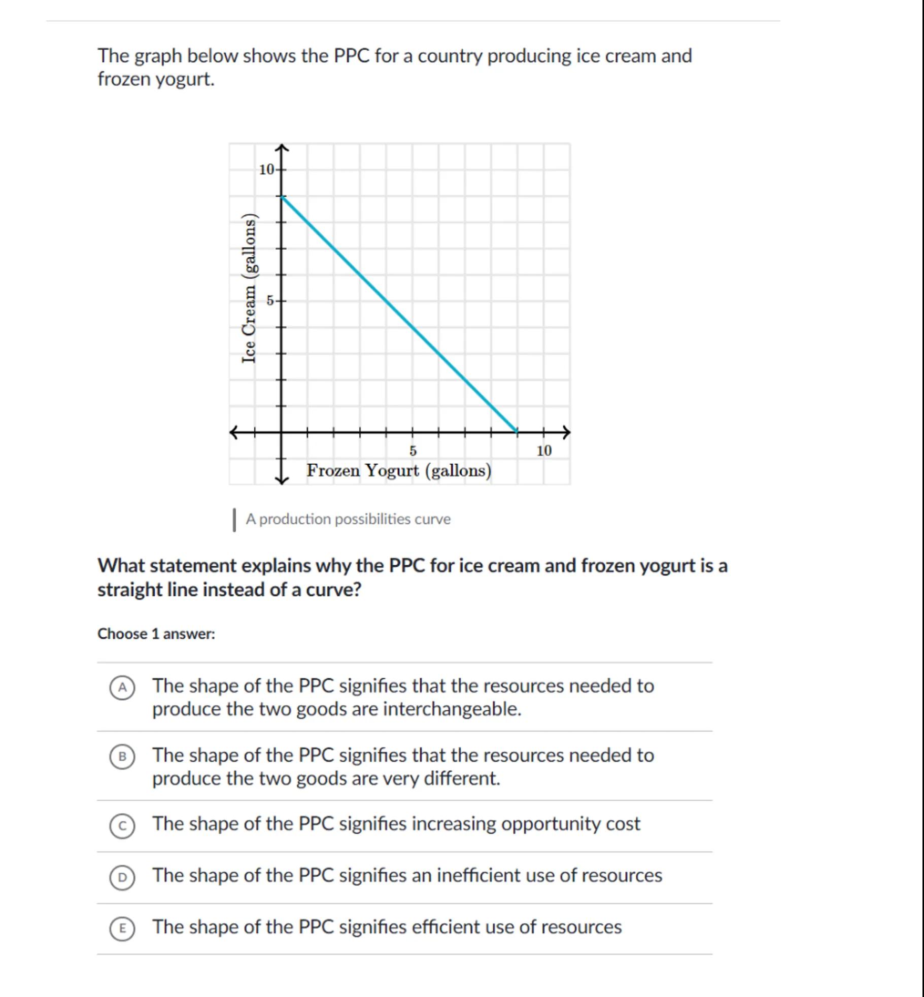 What statement explains why the PPC for ice cream and frozen yogurt is a straight line instead of a curve?