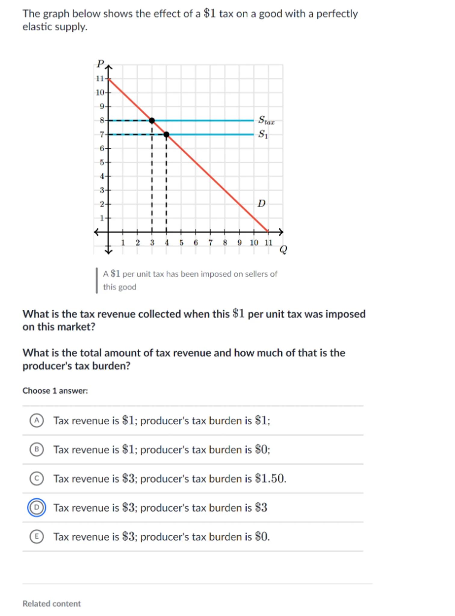 The graph below shows the effect of a tax on a good with a perfectly elastic supply.