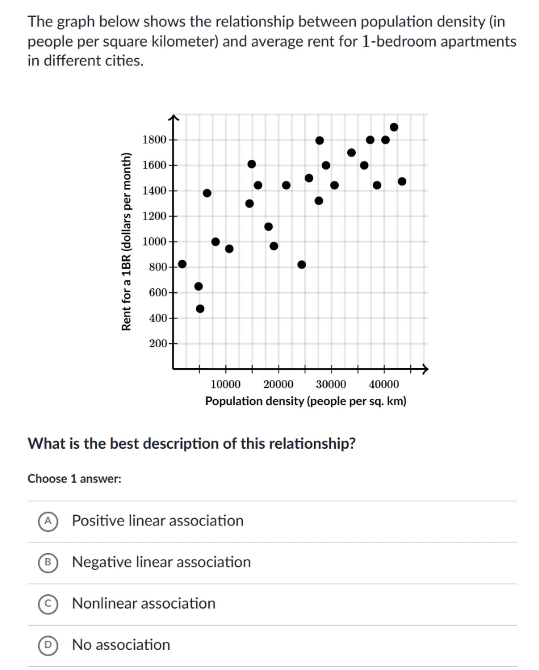 The graph below shows the relationship between population density (in people per square kilometer) and average rent for 1-bedroom apartments in different cities.