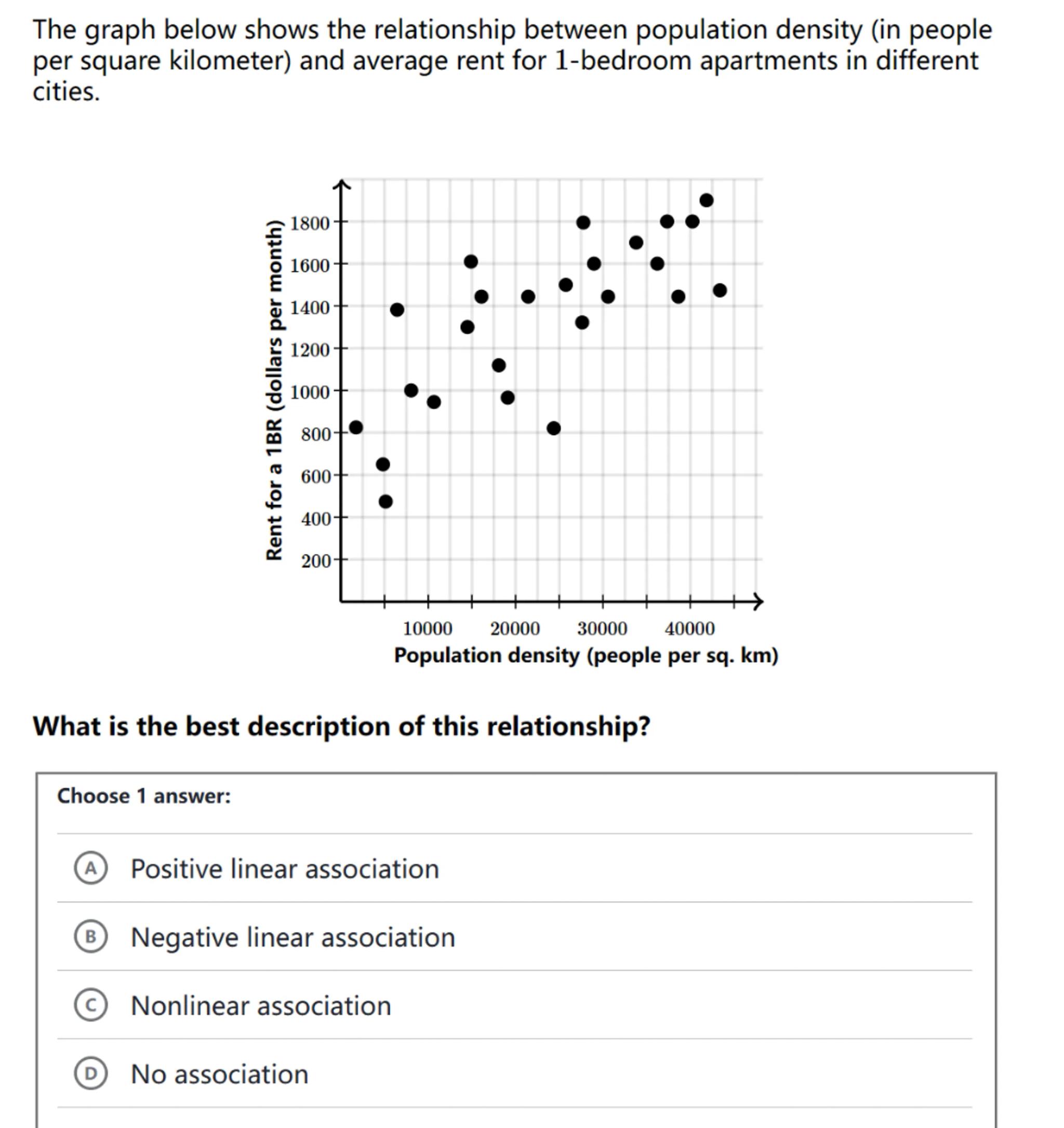 The graph below shows the relationship between population density (in people per square kilometer) and average rent for 1-bedroom apartments in different cities.