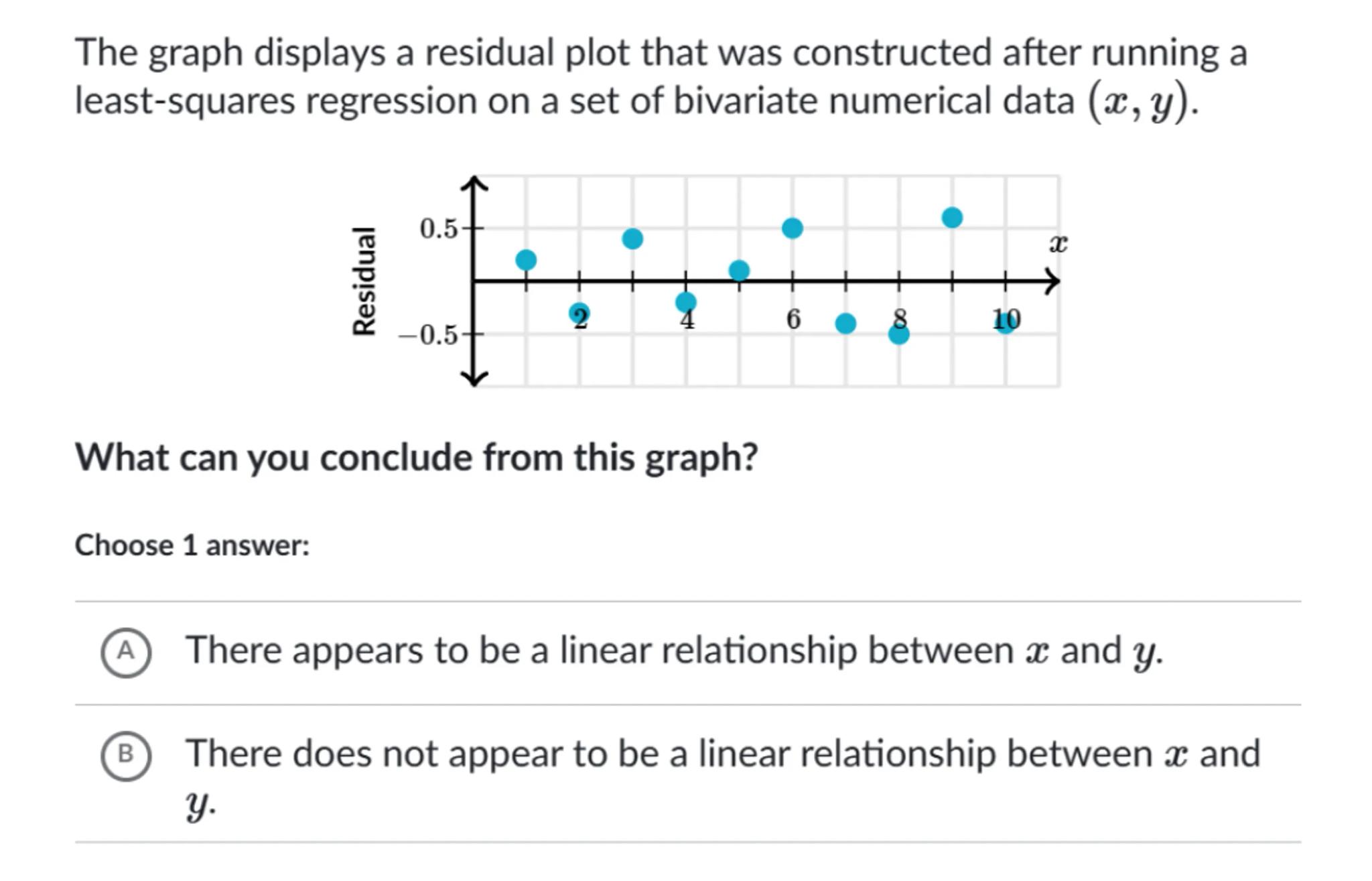 The graph displays a residual plot that was constructed after running a least-squares regression on a set of bivariate numerical data .