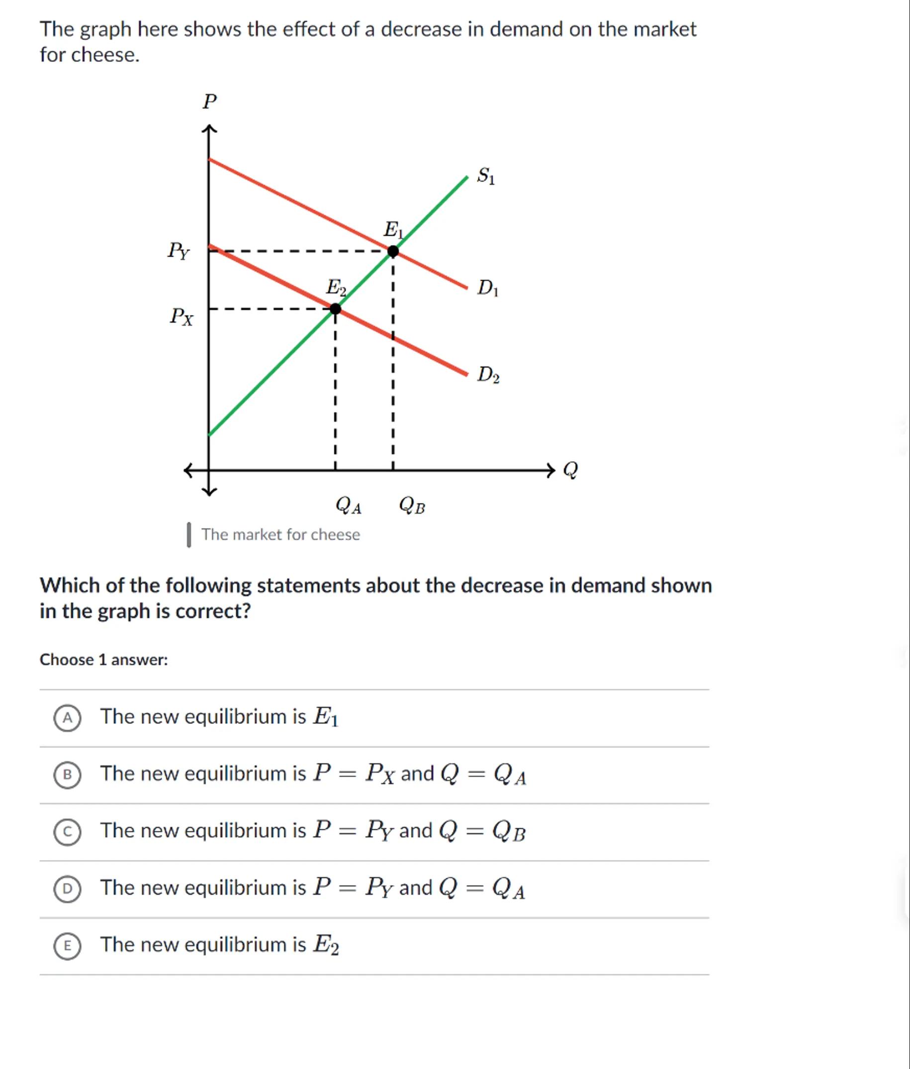 The graph here shows the effect of a decrease in demand on the market for cheese.