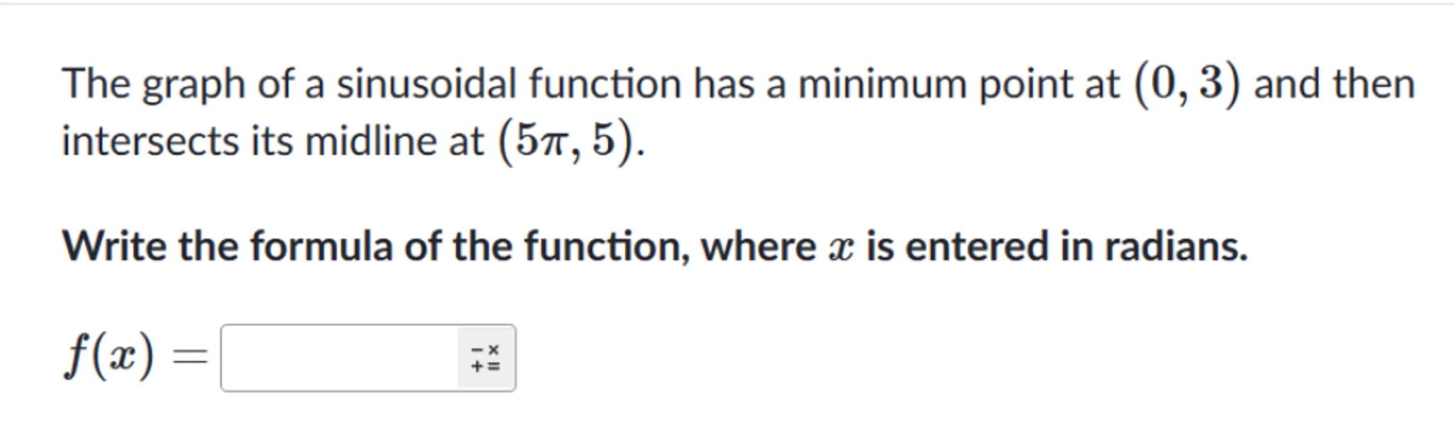 The graph of a sinusoidal function has a minimum point at and then intersects its midline at .