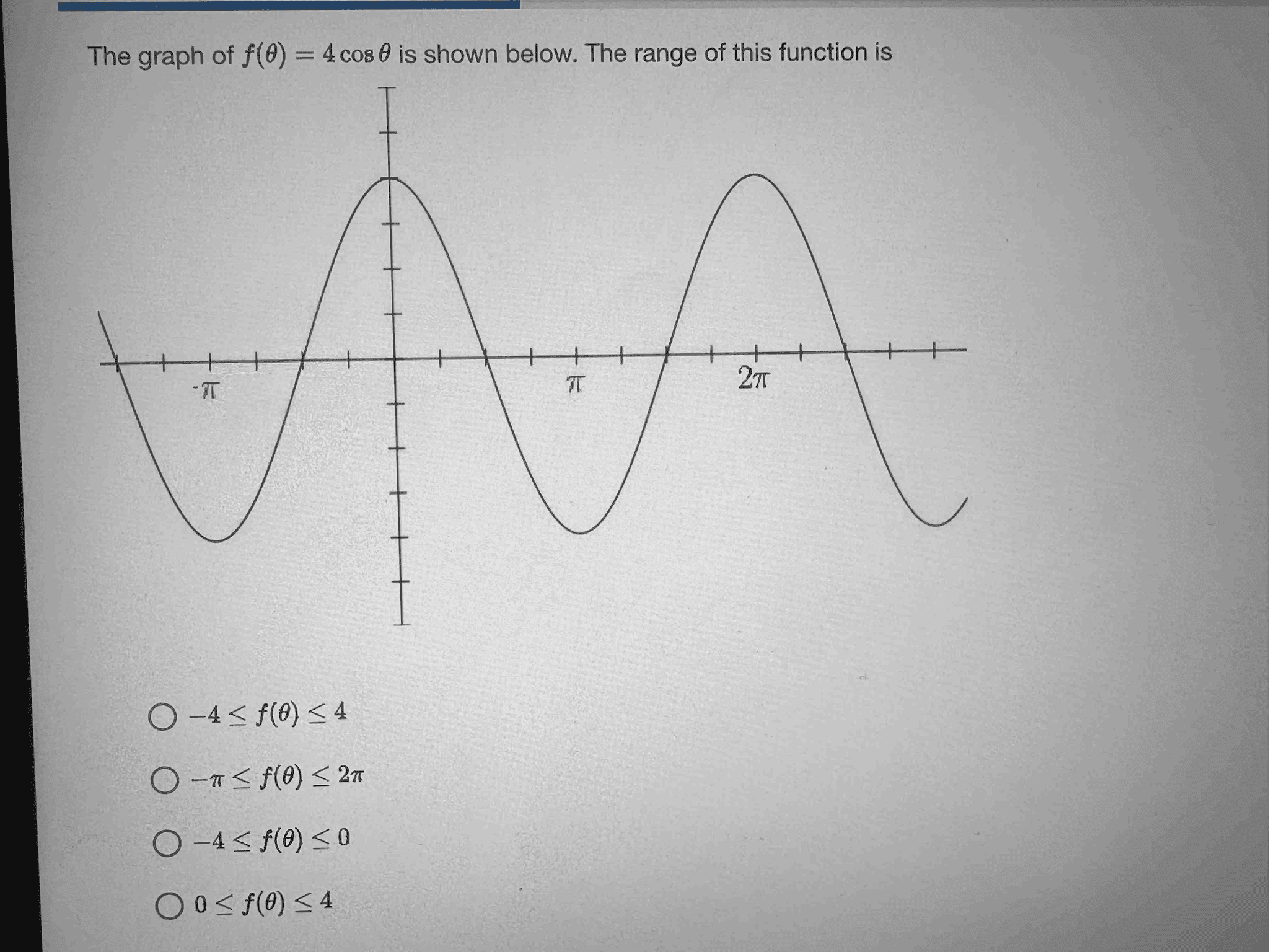 The graph of f(0) = 4 COS A is shown below. The range of this function is