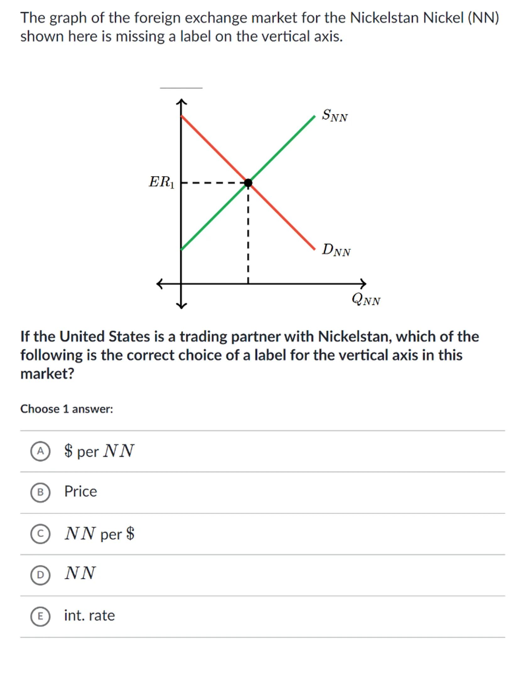 The graph of the foreign exchange market for the Nickelstan Nickel (NN) shown here is missing a label on the vertical axis.