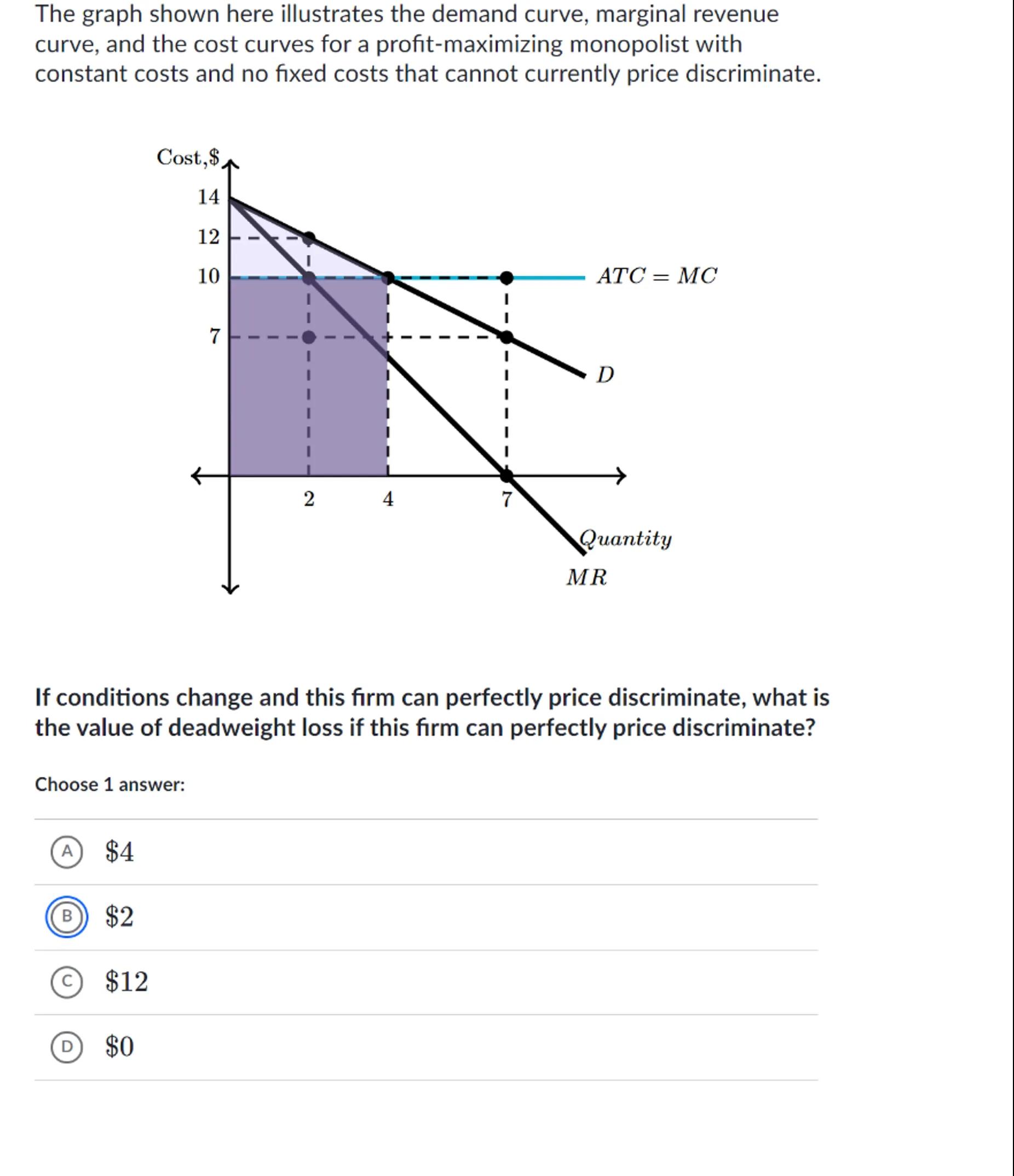If conditions change and this firm can perfectly price discriminate, what is the value of deadweight loss if this firm can perfectly price discriminate?