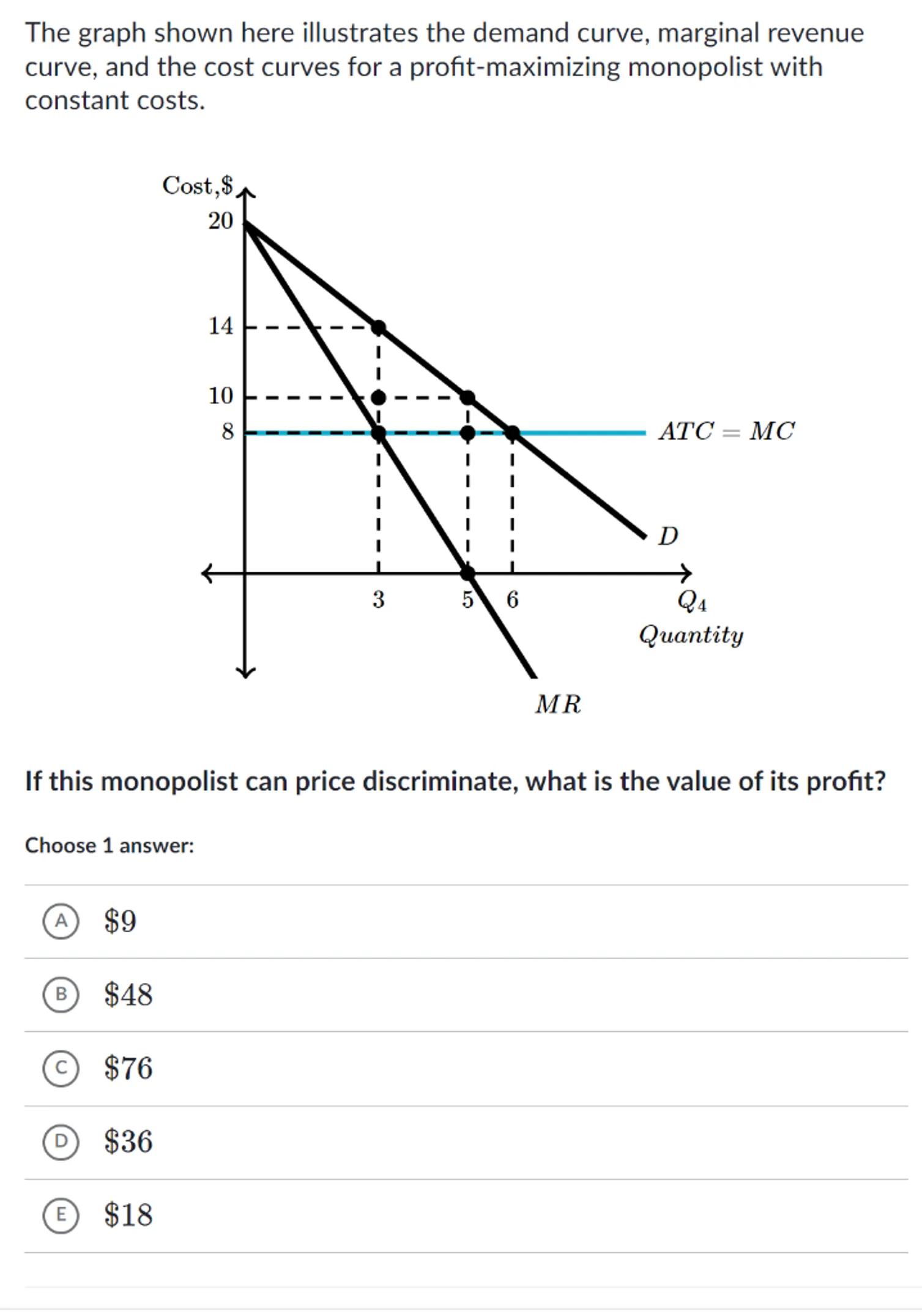 The graph shown here illustrates the demand curve, marginal revenue curve, and the cost curves for a profit-maximizing monopolist with constant costs.