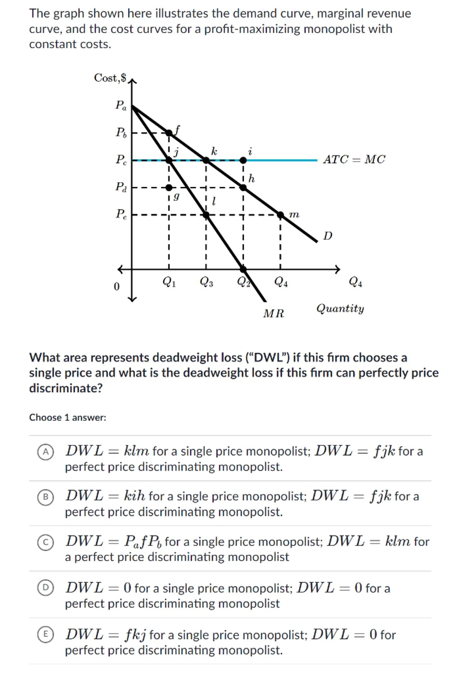 What area represents deadweight loss ("DWL") if this firm chooses a single price and what is the deadweight loss if this firm can perfectly price discriminate?