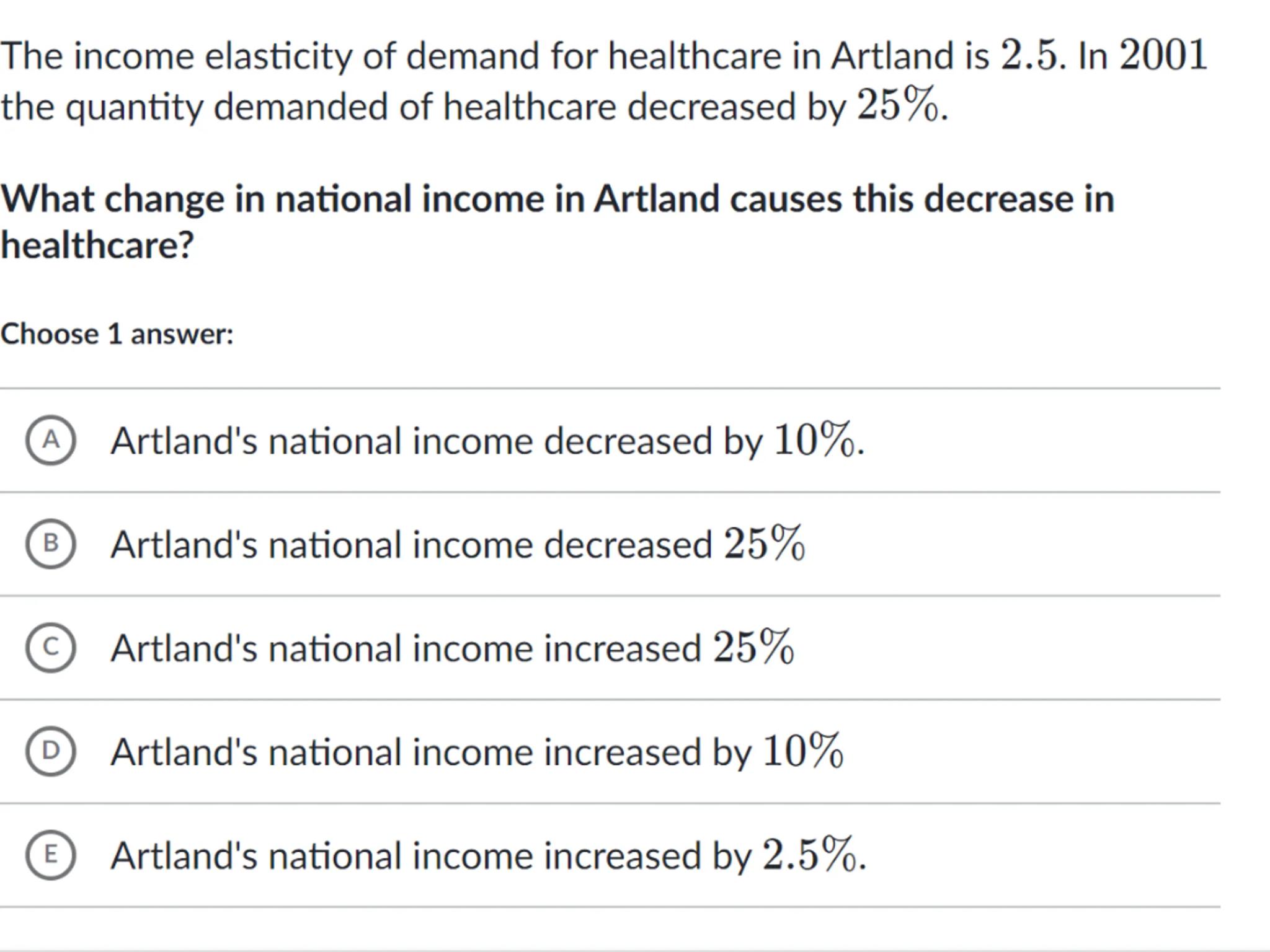 The income elasticity of demand for healthcare in Artland is 2.5. In 2001 the quantity demanded of healthcare decreased by .